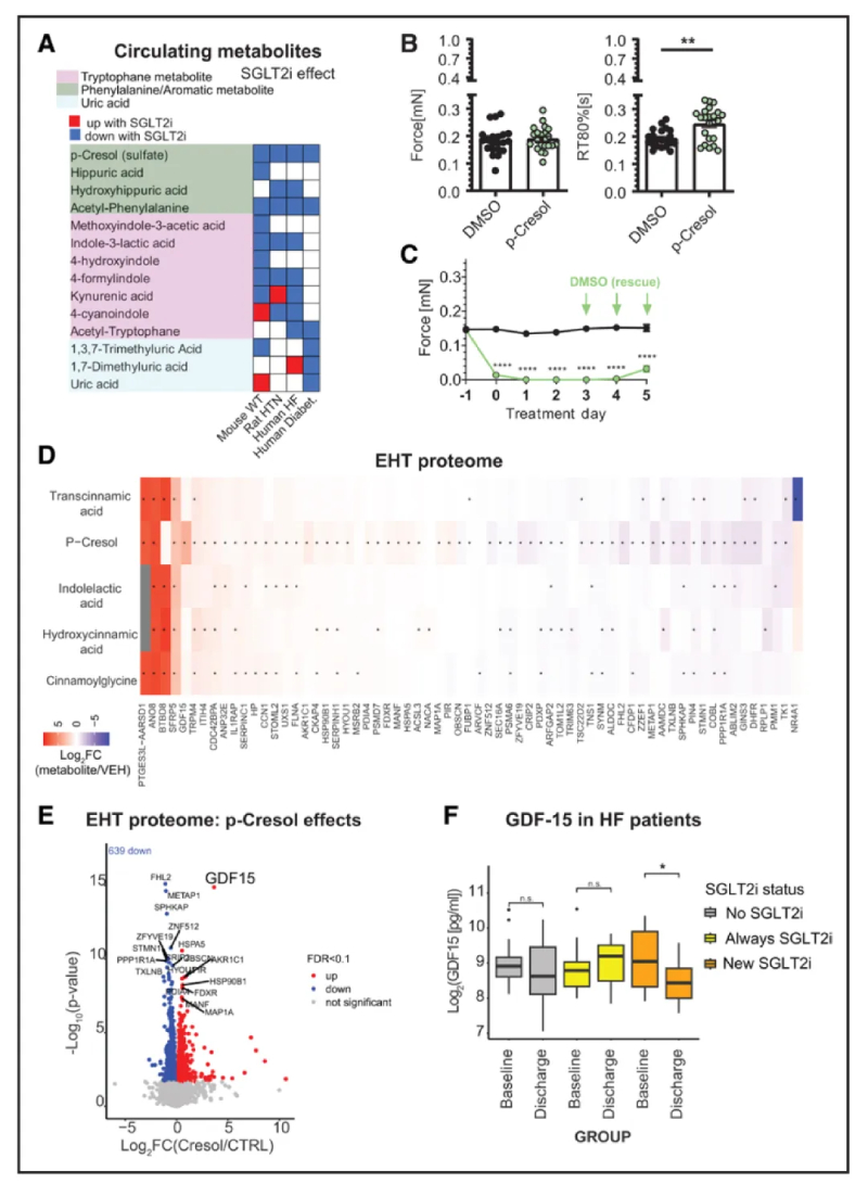 為了進(jìn)一步闡明該機制,對用300μM PCL、吲哚乳酸和3種其他芳香族代謝物處理的 EHT 組織進(jìn)行了蛋白質(zhì)組學(xué)分析(圖7D)。觀(guān)察到最強烈的變化是 PCL 的反應(圖7D)。多種蛋白質(zhì)的增加包括心臟病相關(guān)通道TRPM4、 FLNA和生長(cháng)因子CCN1;減少的蛋白質(zhì)包括 PPP1R1A,其下調已被報道為人類(lèi)HF的標志。PCL改變的蛋白質(zhì)組的一個(gè)獨特特征是心臟肌節相關(guān)蛋白的減少(圖S7D),以及應激信號 GDF15的強烈感應(圖7E)??紤]到HF患者中該通路的調節,檢測了GDF15 水平,發(fā)現接受SGLT2i治療心力衰竭的患者循環(huán) GDF15 減少(圖7F)。
