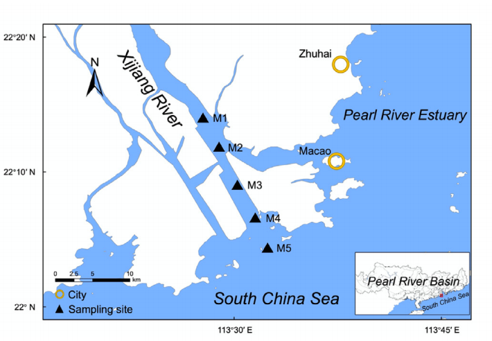 - 從M1到M5的采樣點(diǎn)鹽度升高,每對采樣點(diǎn)之間有顯著(zhù)差異(P < 0.05);