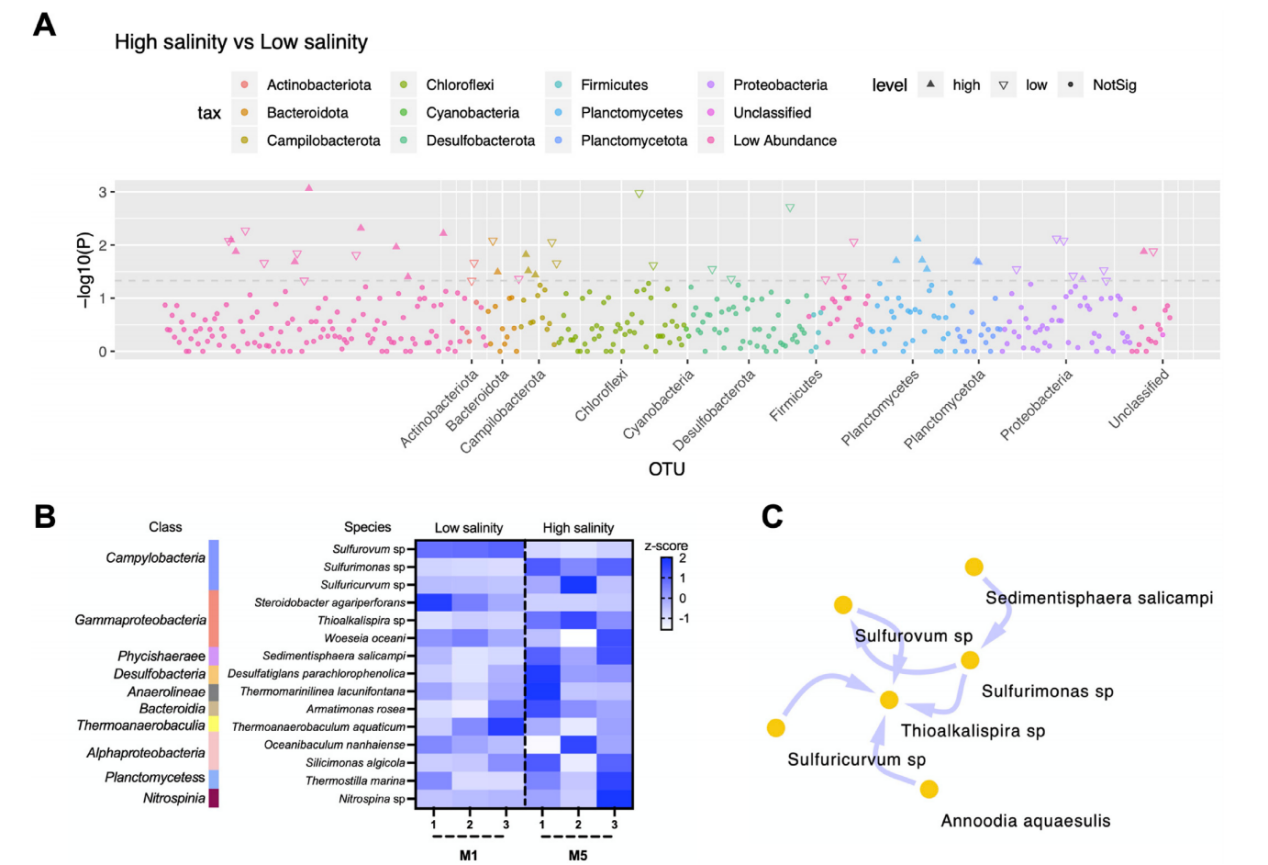 - 沉積性細菌群落中最豐富的15個(gè)細菌OTUs來(lái)自10個(gè)類(lèi)別,其中彎曲桿菌和伽馬變形菌門(mén)是最重要的類(lèi)群,各有3種。與此同時(shí),有11個(gè)物種在高鹽度中富集,包括硫脲、硫單胞菌、彎曲桿菌、硫堿桿菌、熱厭氧菌等;