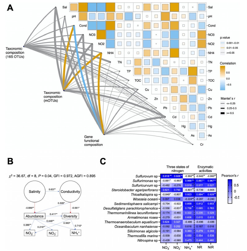 - Pearson相關(guān)分析顯示,優(yōu)勢細菌分類(lèi)群Sulfurovum sp.和sulphimonas sp.與氮形態(tài)(NO2?、NO3?和NH4+)和酶活性(NR和NiR)顯著(zhù)相關(guān)(P < 0.05);