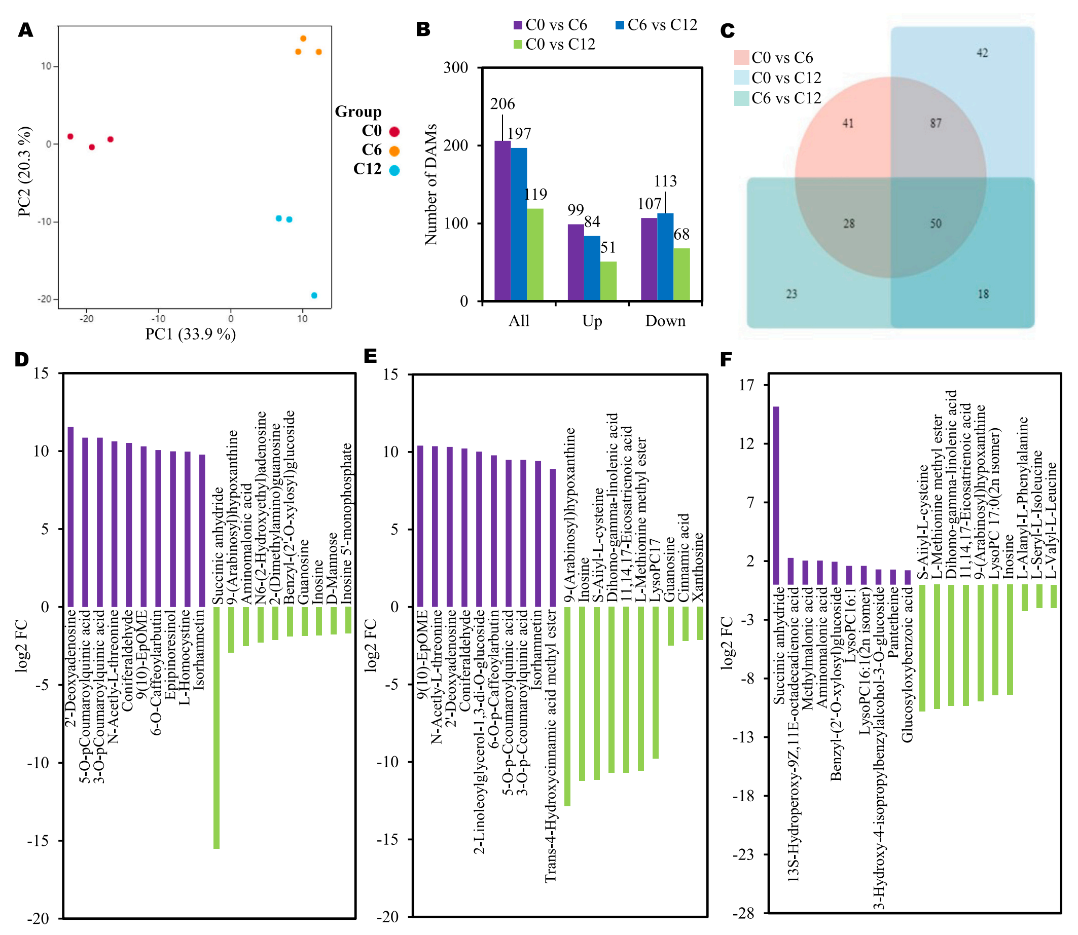 為了比較芋頭切片褐變過(guò)程中三個(gè)階段代謝物組成的差異,研究通過(guò)植物廣靶代謝組學(xué)分析,總共成功鑒定了芋頭切片中的638種代謝物。PCA分析顯示,三個(gè)儲存點(diǎn)采集的芋頭樣品具有明顯的分離性(圖2A)。在C0 vs C6中,共鑒定出206個(gè)DAMs,其中99個(gè)DAMs的豐度增加,107個(gè)DAMs的豐度減少。C6 vs C12共197個(gè)DAMs,分別有84個(gè)DAMs豐度增加,113個(gè)DAMs豐度減少。C0 vs C12包括119個(gè)DAMs,分別有51個(gè)DAMs和68個(gè)DAMs顯示豐度增加和減少(圖2B)。這些結果表明,在褐變過(guò)程中,代謝物豐度的減少幅度更大。
