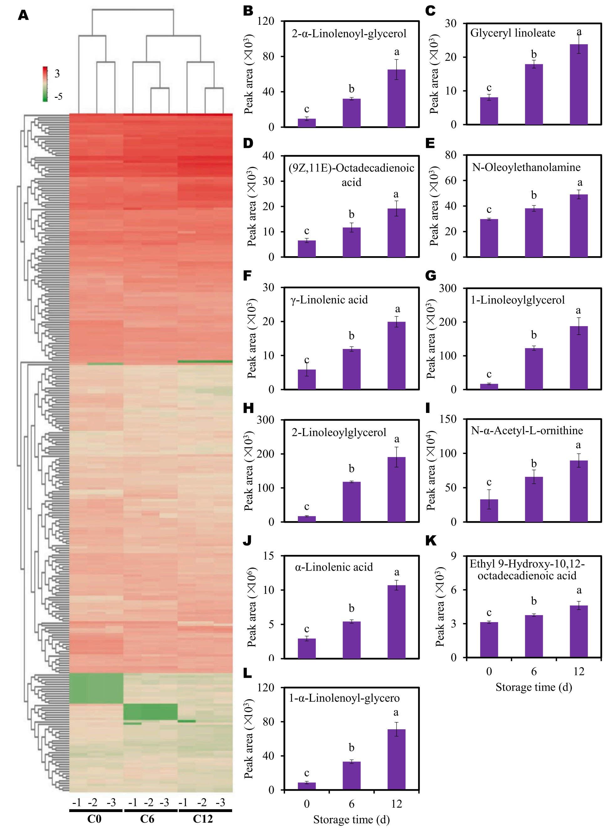 在C0和C12中,9(10)- epOME、n -乙酰- L-蘇氨酸、2 ‘ -脫氧腺苷、5- O -對香豆?;鼘幩?、2-亞麻油基甘油-1,3-二- O -糖苷、松木醛、6- O -對咖啡?;芄?、異鼠李素、3-O-對香豆?;鼘幩岷头词?4-羥基肉桂酸甲酯在C12組中含量較高。相反,9-(阿拉伯糖基)次黃嘌呤、肌苷、S – aiiyl -L -半胱氨酸、8,11,14-二十烷三烯酸甲酯、L-蛋氨酸甲酯、LysoPC17:0、鳥(niǎo)苷、肉桂酸、11、14、17-二十碳三烯酸和黃嘌呤在C0組中表現出更高的豐度(圖2F)。