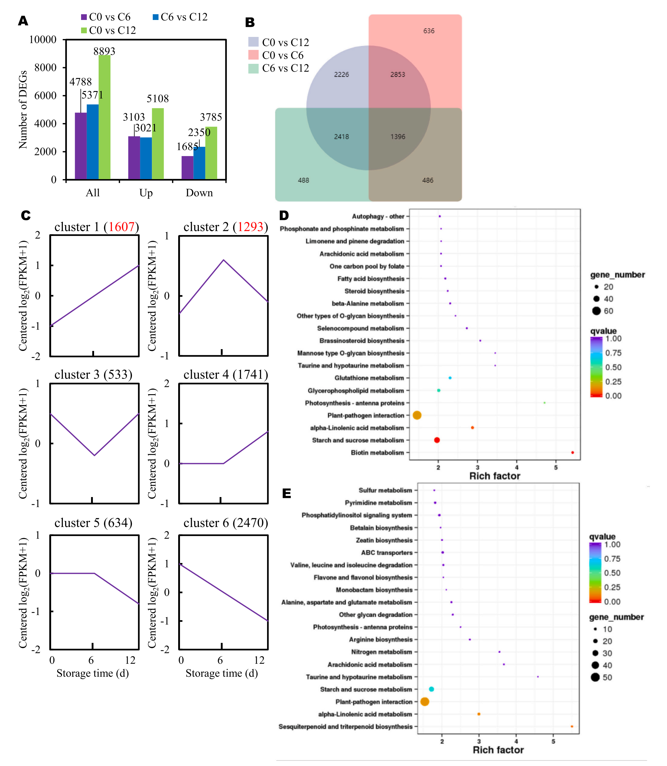 為了更好地了解基因表達的變化,該研究進(jìn)行比較轉錄組分析。結果顯示許多基因在芋褐變過(guò)程中表現出不同的表達譜。具體來(lái)說(shuō),在C0和C6的比較中,鑒定出3103個(gè)表達上調的基因和1685個(gè)表達下調的基因。同樣,在C6和C12組的比較中,發(fā)現3021個(gè)DEGs上調,2350個(gè)DEGs下調。此外,與C0組相比,C12組有5108個(gè)基因的表達量更高(圖4A)。在褐變過(guò)程中發(fā)現了更多的上調基因,表明芋頭的基因表達發(fā)生顯著(zhù)的變化。有趣的是,當比較C0與C6、C6與C12、C0與C12之間的DEGs時(shí),發(fā)現1396個(gè)DEGs重疊(圖4B)。