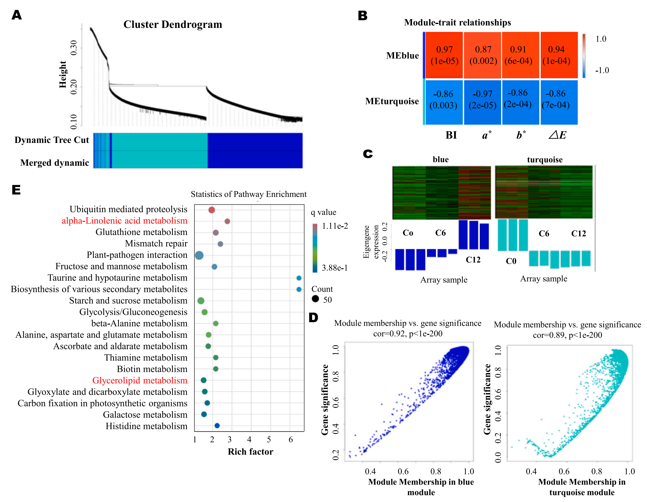 為了進(jìn)一步研究脂質(zhì)代謝與冷藏芋頭切片褐變之間的關(guān)系,研究采用WGCNA分析進(jìn)行研究。如圖5A所示,鑒定出兩個(gè)與切片芋頭在冷藏期間褐變發(fā)育顯著(zhù)相關(guān)的模塊。藍色模塊中基因與褐變BI、a*、b*、△E 4項指標呈正相關(guān),而綠松石模塊中基因與褐變指標呈負相關(guān)(圖5B)。此外,隨著(zhù)褐變的發(fā)展,藍色模塊中基因的表達量逐漸增加,而綠松石模塊中基因的表達量逐漸減少(圖5C)。此外,藍色和綠松石模塊中每個(gè)基因與褐變的相關(guān)性都很高(圖5D),說(shuō)明這兩個(gè)模塊的基因與冷藏芋頭片的褐變發(fā)育高度相關(guān)。