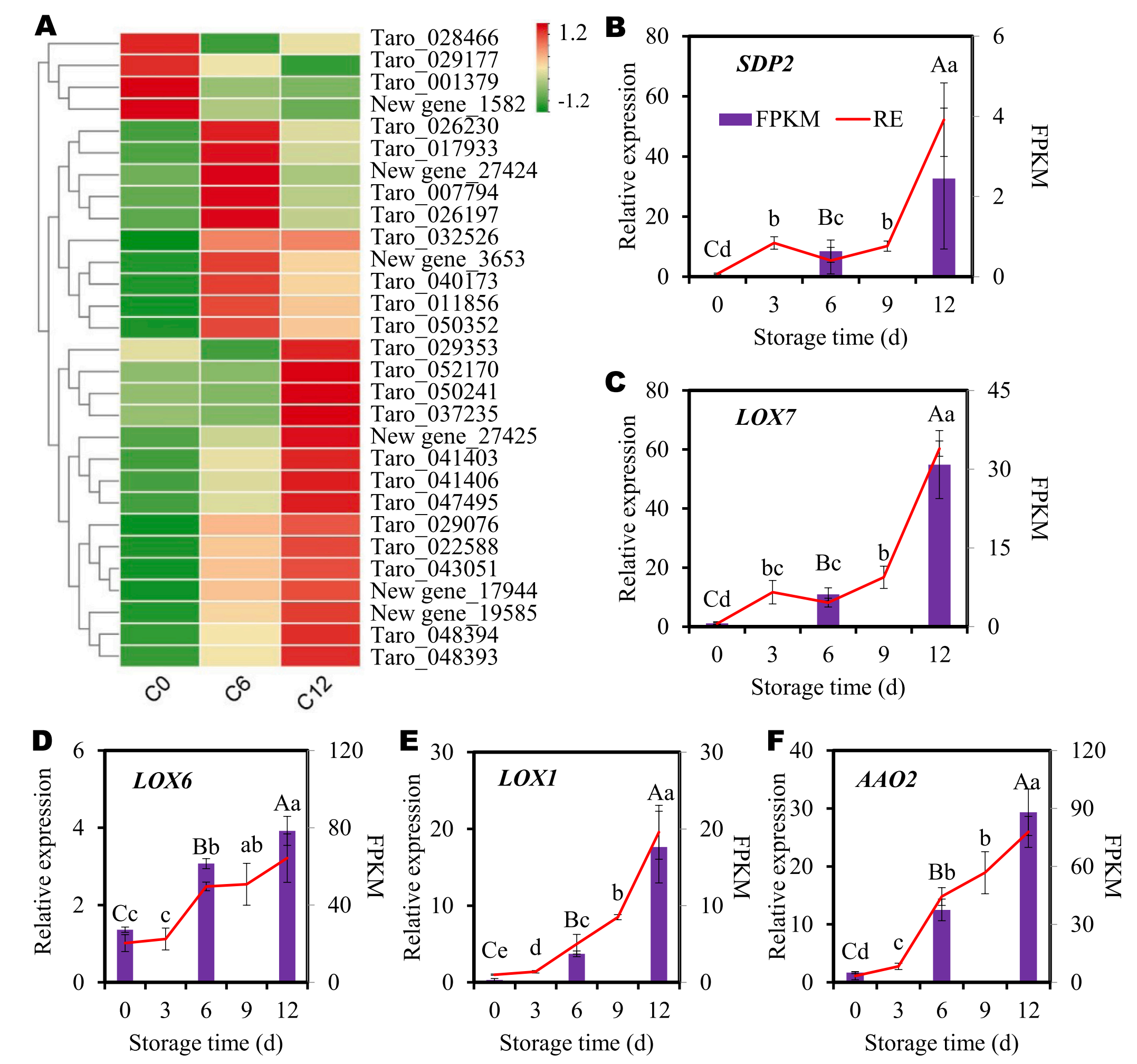 為了驗證RNA-seq數據的質(zhì)量,研究檢測了亞麻酸代謝途徑中DEGs的表達模式。在切片芋頭褐變過(guò)程中,該途徑中的DEGs差異表達(圖6A)。在這些基因中,4個(gè)基因(taro_028466、029177、001379new gene_1582)的表達量在第6天較0天下降(圖6A)。10個(gè)基因(taro_026230、017933、007794、026197、032526、040173、011856、050352以及new gene_274243563)的表達量在第6天出現了增加,隨后又出現了下降。然而,這些基因在第12天的表達水平仍然高于第0天(圖6A)。其余15個(gè)基因在褐變過(guò)程中表現出穩定的表達增加。這些結果再次證實(shí)了亞麻酸代謝參與了芋頭褐變過(guò)程。