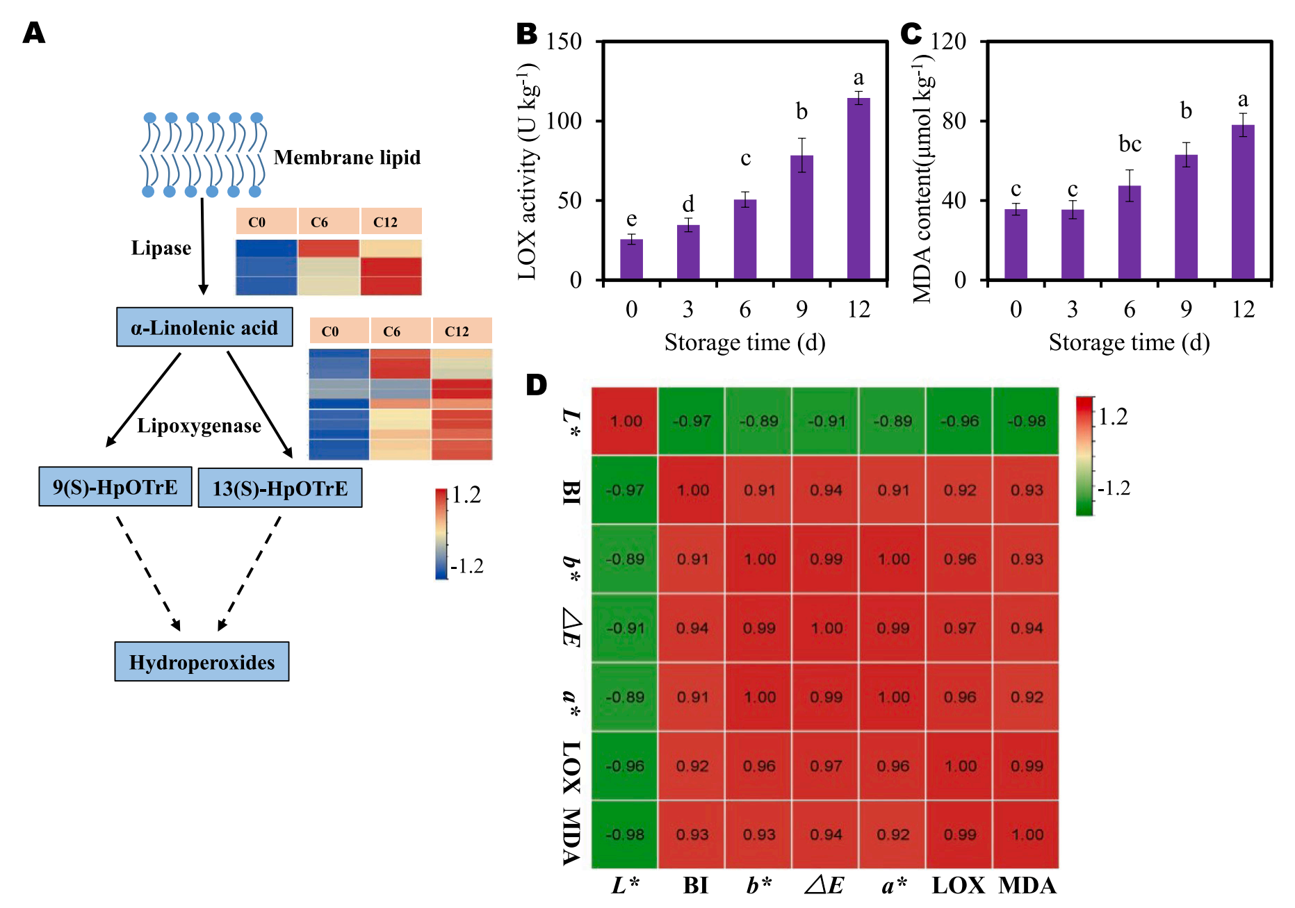 丙二醛通常被認為是植物脂質(zhì)過(guò)氧化的生物標志物。為了監測切片芋頭褐變過(guò)程中膜脂過(guò)氧化情況,測定了LOX活性和MDA含量。隨著(zhù)時(shí)間的推移,LOX活性和MDA含量隨著(zhù)褐變繼續進(jìn)行逐漸升高 (圖7B, C)。這些結果表明,在褐變過(guò)程中,膜脂過(guò)氧化加劇。此外,相關(guān)分析顯示,LOX活性、MDA含量和其他褐變指標之間存在很強的相關(guān)性?(圖7D)。這些結果進(jìn)一步支持了膜脂過(guò)氧化和/或代謝參與芋頭褐變。