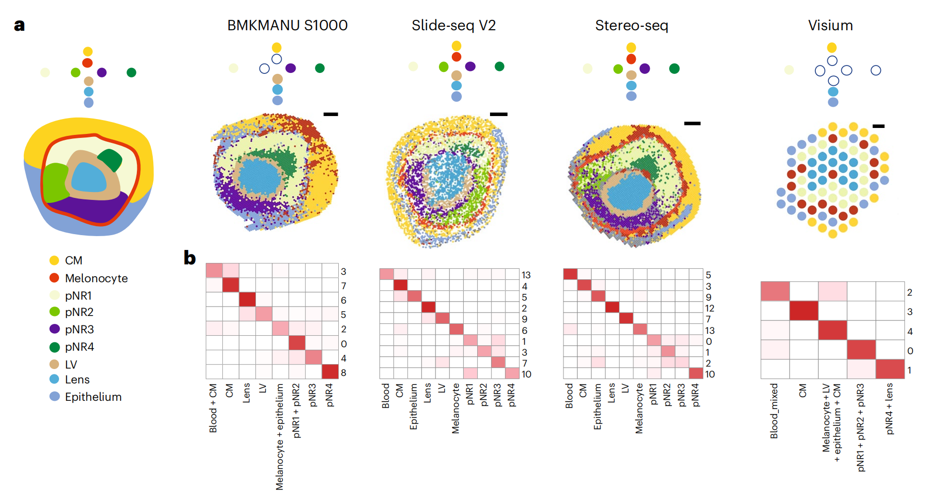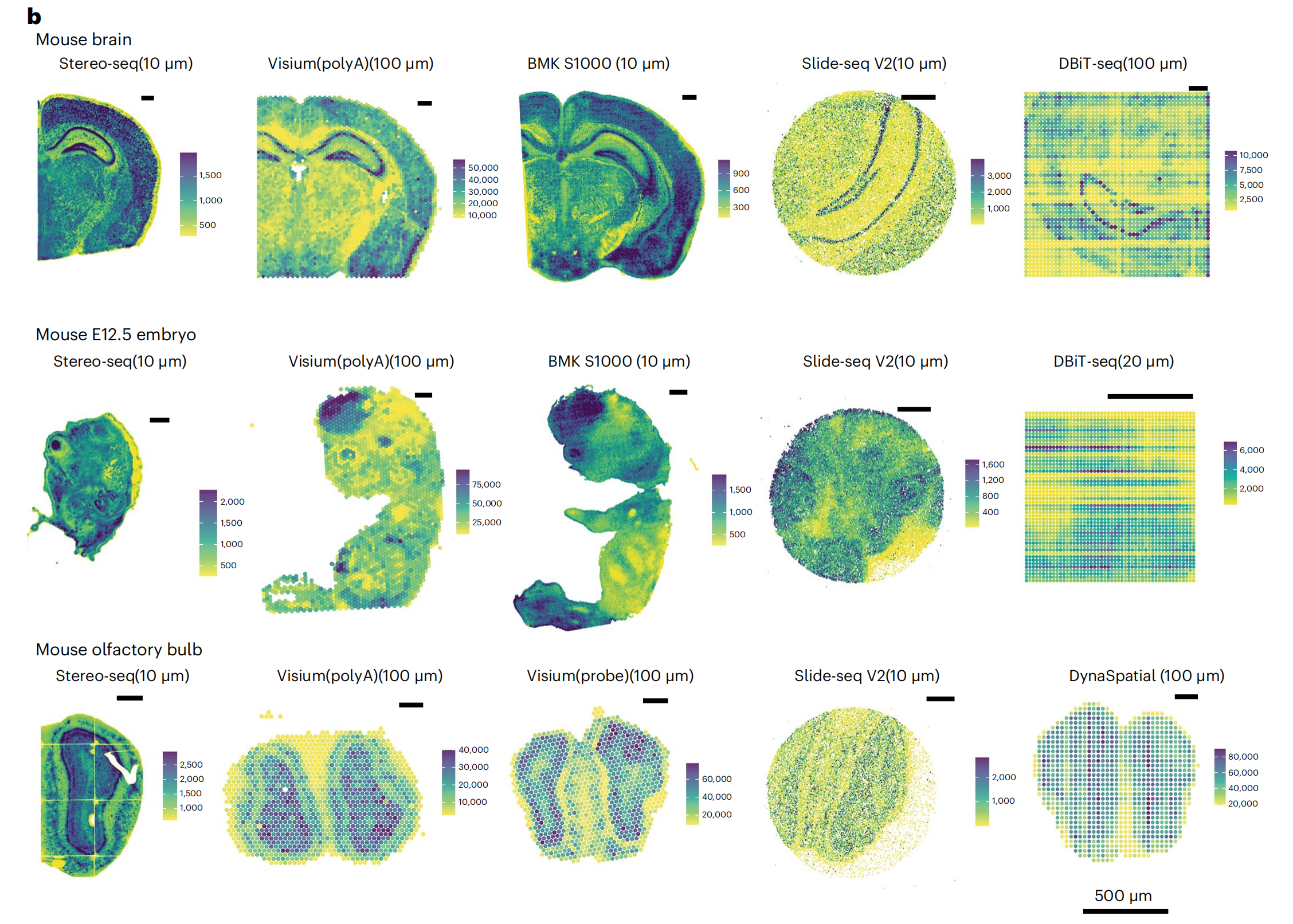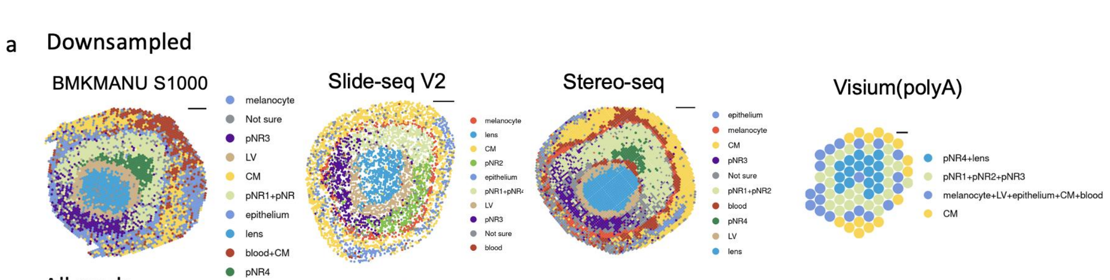 使用11種sST技術(shù),對三種組織進(jìn)行實(shí)驗,測序及分析,并對可以實(shí)現更高分辨率的BMKMANU S1000、Stereo-seqSlide-seqV2?在細胞級(10μm)分辨率下進(jìn)一步進(jìn)行了分析。