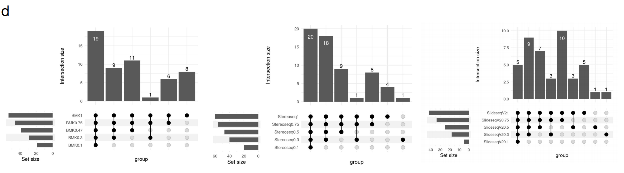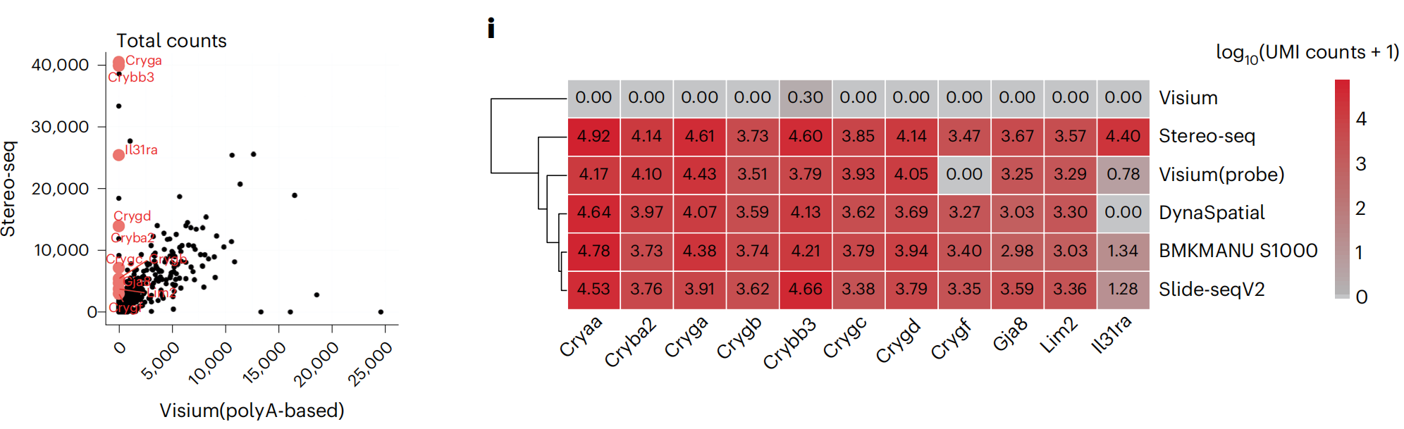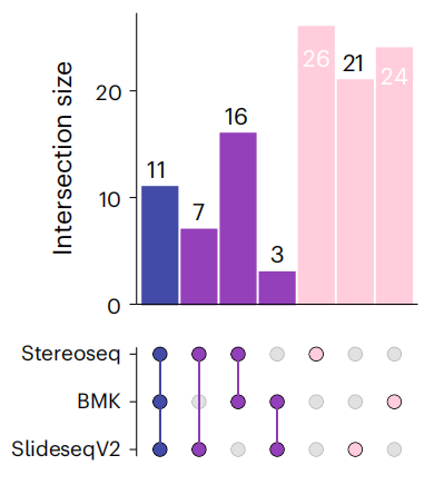 文中對visium(polyA-based)未能捕獲到的基因,在其它技術(shù)平臺中的表現也做了統計,其中BMKMANU S1000、Stereo-seqSlide-seqV2都展現出了統一且全面的基因捕獲性能。