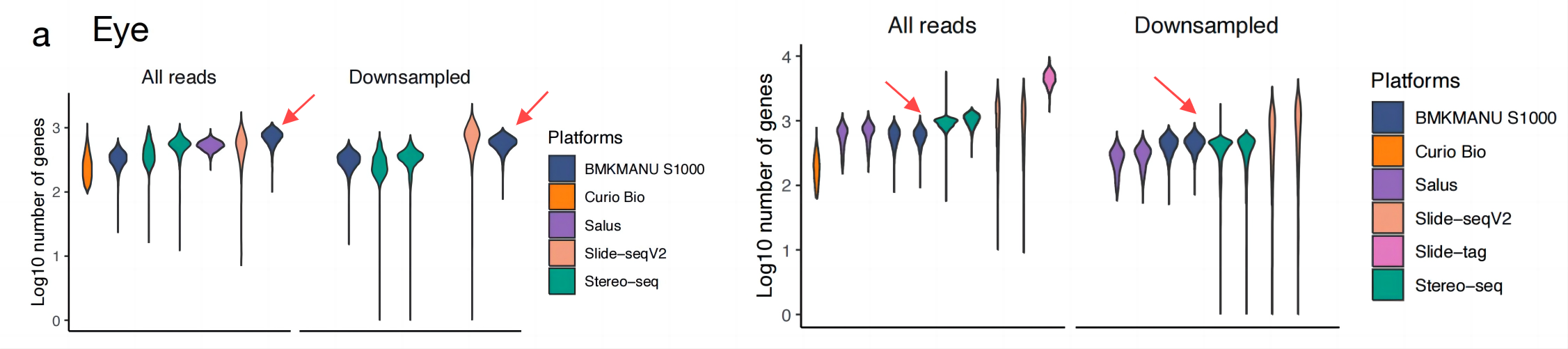 在各個(gè)平臺的捕獲性能測試中,文章通過(guò)對相同捕獲面積內的UMI數進(jìn)行統計,以此來(lái)進(jìn)行捕獲效率的評判,文中分別對原始測序下,以及數據歸一化條件下,進(jìn)行了統計,展示出了較大的差異,這意味著(zhù)不同的測序量對UMI的檢出存在較大的影響,高的數據量可以明顯提升UMI的檢出,隱性表示空間組學(xué)應需要比單細胞更高的測序深度。