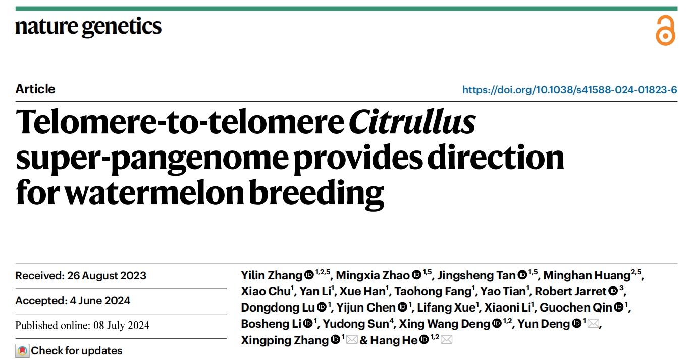 2024年7月8日,北京大學(xué)現代農業(yè)研究院在國際頂尖期刊《自然-遺傳學(xué)》上在線(xiàn)發(fā)表了題為T(mén)elomere-to-telomere?Citrullus?Super-pangenome Provides Direction for Watermelon Breeding的研究成果,是西瓜科研領(lǐng)域的重大突破。
