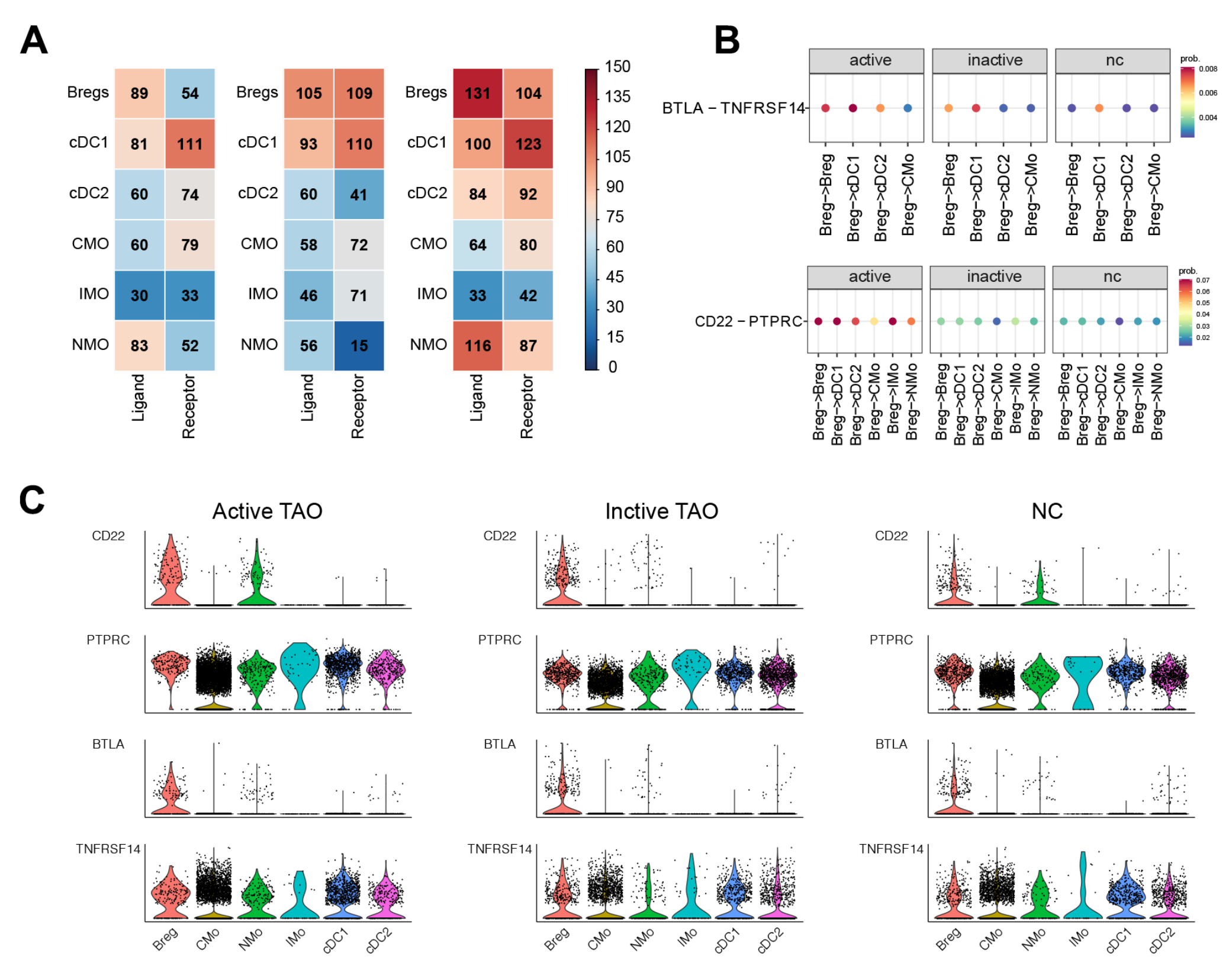 進(jìn)一步檢查了活躍TAO背景下Breg、DC和單核細胞之間的細胞相互作用。該分析總共確定了1,352對重要的相互作用。值得注意的是,Bregs被發(fā)現表現出最多數量的配體,而cDC1亞簇則表現出最多數量的受體。值得注意的是,與非活性TAO 和正常對照組(NC)相比,Bregs在活性TAO中顯示出配體數量增加(圖7A)。