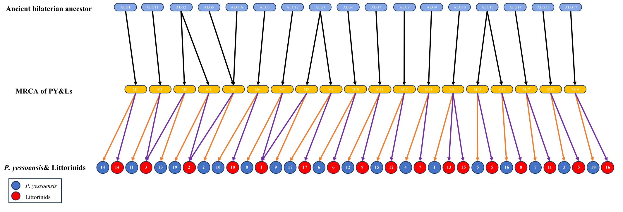 圖3-簡(jiǎn)約核型演化歷程推演及濱螺和扇貝共同祖先(MRCA of PY &Ls)核型構建