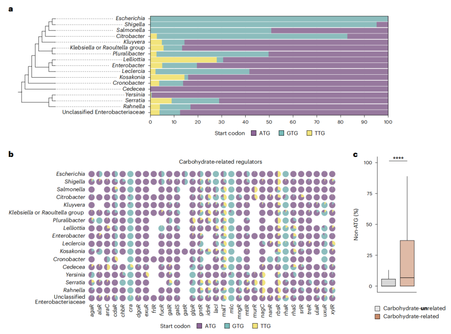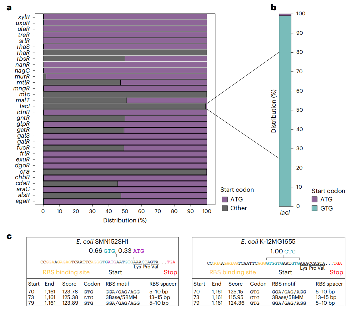 研究人員分析了 10643 個(gè)大腸桿菌基因組,發(fā)現 32 個(gè)碳水化合物代謝調節基因中,有 13 個(gè)基因具有非標準起始密碼子,例如 GTG 或 TTG。其中,lacI 基因幾乎全部包含非標準起始密碼子,而 rbsR、murR、mltR、malT、gntR、gatR、fucR、araC 和 alsR 等基因則同時(shí)存在 ATG 和非標準起始密碼子。這種現象表明非標準起始密碼子在碳水化合物代謝調節中可能具有重要作用。