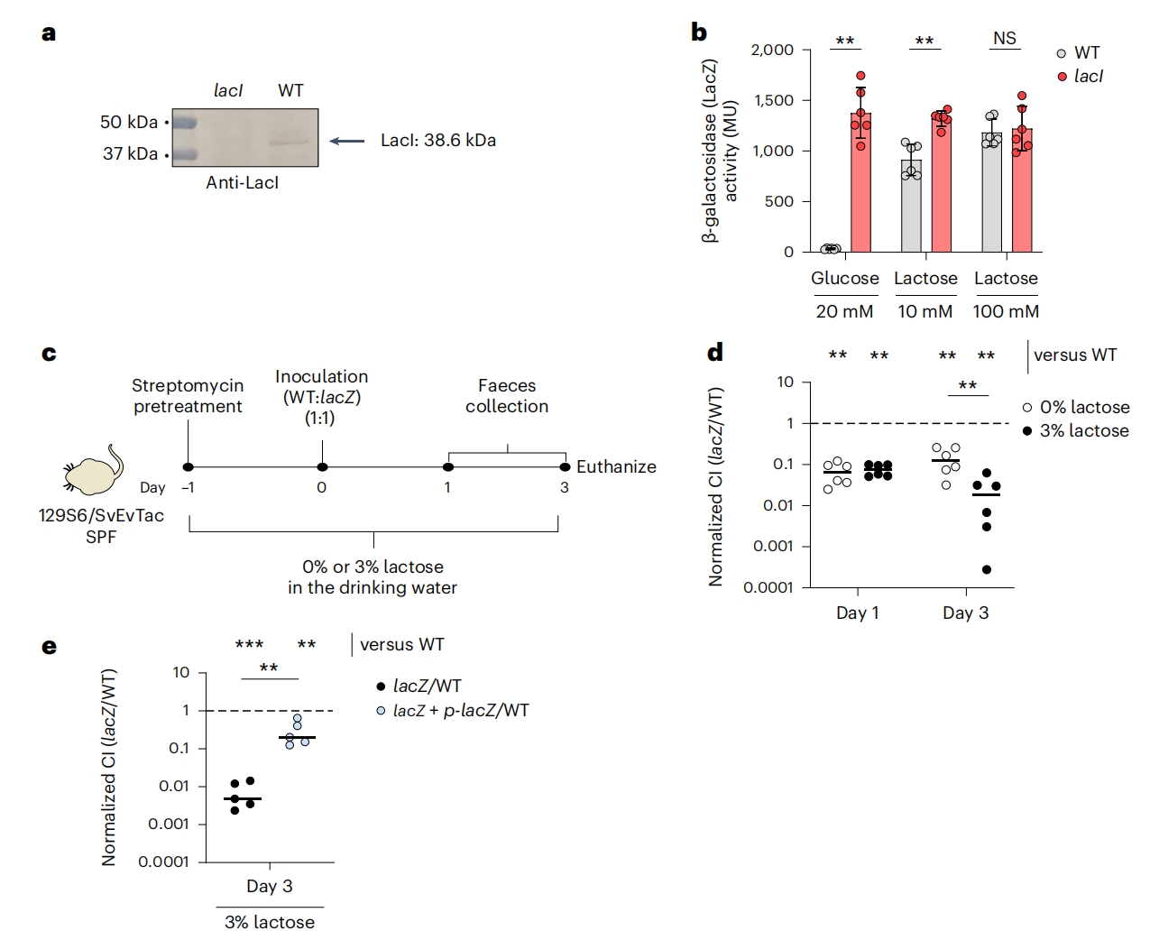 研究人員使用小鼠模型,比較了野生型大腸桿菌 8178 菌株和 lacZ 突變體菌株在富含乳糖條件下的生長(cháng)情況。結果顯示,野生型菌株的生長(cháng)速度更快,這表明 lacZYA 操縱子在腸道定植中起著(zhù)重要作用。lacZYA 操縱子負責乳糖的代謝,野生型菌株能夠更有效地利用乳糖,從而獲得競爭優(yōu)勢。