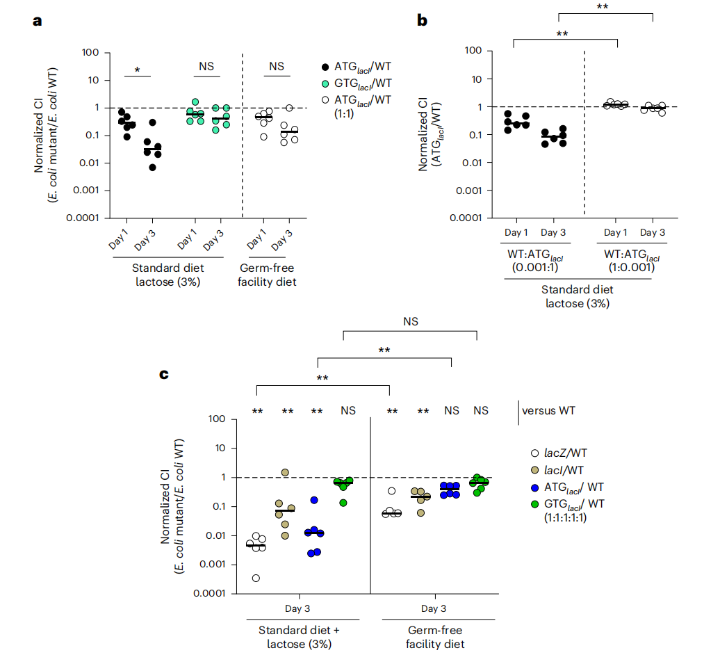 研究人員在不同的小鼠模型和飲食條件下,比較了 lacZ 突變體菌株的適應性。結果顯示,在不同條件下,lacZ 突變體菌株的適應性表現出差異,這表明 lacI GTG 起始密碼子的優(yōu)勢是上下依賴(lài)性的。例如,在無(wú)菌小鼠中,lacZ 突變體菌株的生長(cháng)劣勢更加明顯,這表明腸道微生物群可能對 lacZYA 操縱子的活性產(chǎn)生影響。此外,不同飲食中乳糖含量的差異也可能影響 lacZ 突變體菌株的適應性。