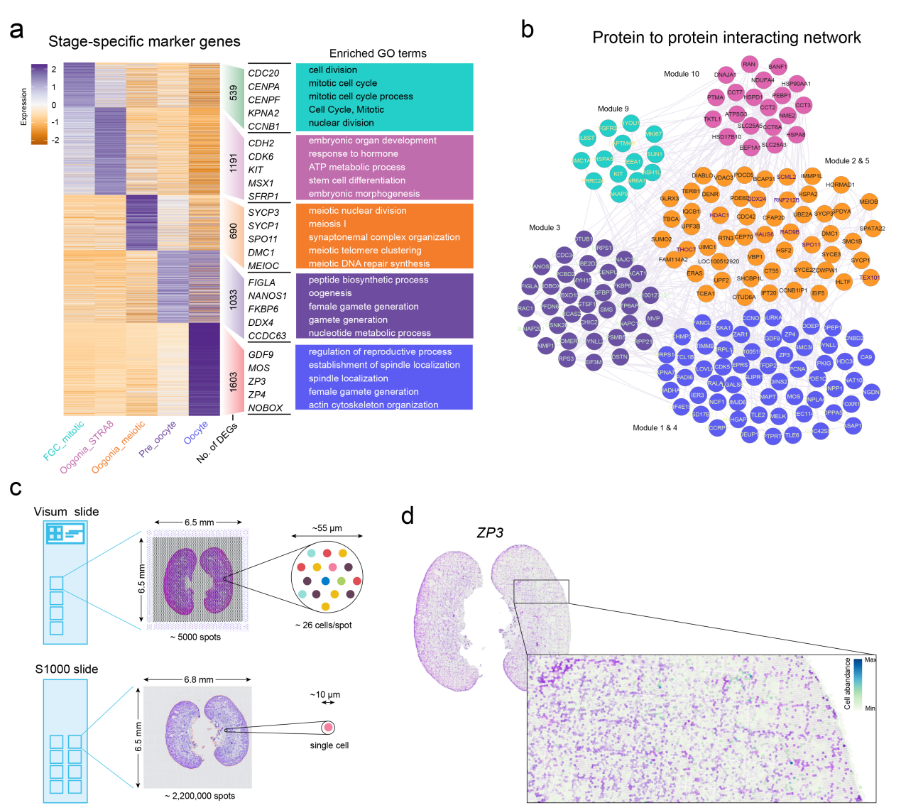 為了進(jìn)一步驗證分析,研究人員還在同一E65卵巢組織上使用了更高分辨率(BMKMANU S1000;Spot點(diǎn)大小約為10微米)的平臺進(jìn)行了ST測序。結果與E65時(shí)的Visium ST解卷積一致,使用S1000平臺在E65時(shí)可視化ZP3陽(yáng)性卵母細胞的空間位置也證實(shí)了其在內皮層的表達。