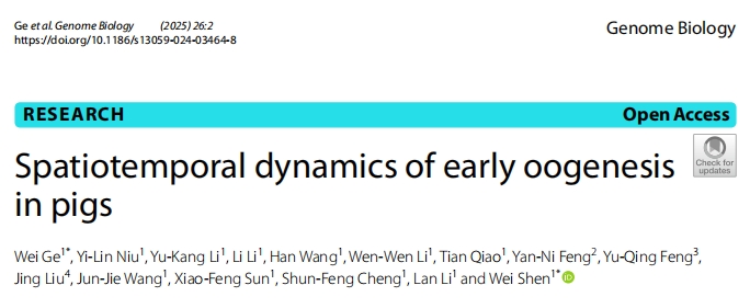 2025年1月,青島農業(yè)大學(xué)葛偉教授與沈偉教授團隊在學(xué)術(shù)期刊《Genome Biology》上發(fā)表了一篇題為《Spatiotemporal dynamics of early oogenesis in pigs》的研究論文。該研究利用了單細胞RNA測序和空間轉錄組技術(shù),解析了豬早期卵子發(fā)生中的基因表達及空間組織特征。研究發(fā)現,豬生殖細胞在卵巢中呈“皮質(zhì)到髓質(zhì)”分布,且與人類(lèi)卵子發(fā)生過(guò)程相似,表明豬是研究人類(lèi)卵子發(fā)生的良好模型。RNA速度分析揭示了顆粒細胞譜系特征,空間共定位分析和細胞通訊分析顯示皮質(zhì)與髓質(zhì)區域生殖細胞與體細胞通訊模式不同,特別是NOTCH信號通路和ECM蛋白在調控中起關(guān)鍵作用,強調了卵巢微環(huán)境對生殖細胞命運的重要性。
