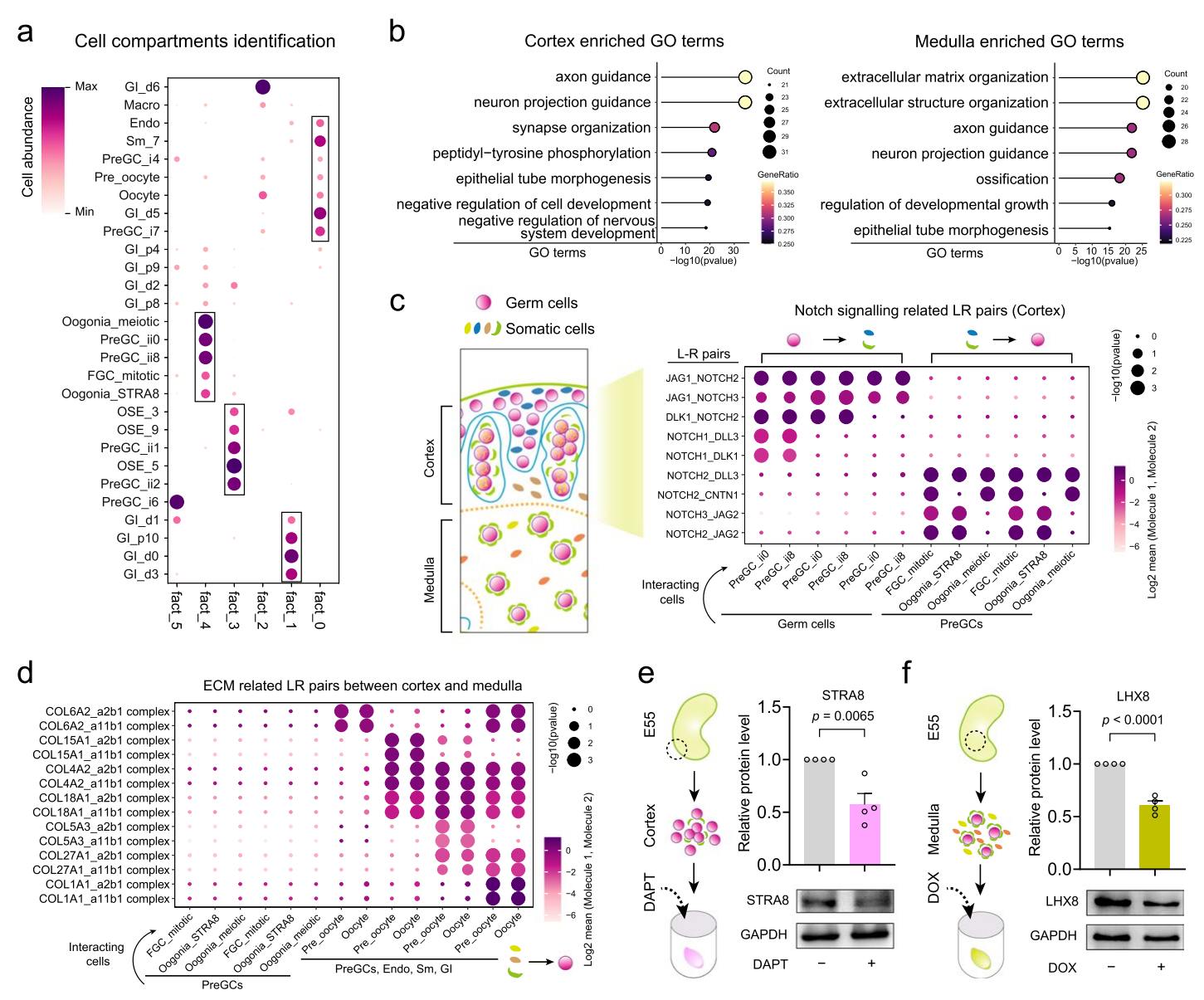 為了進(jìn)一步驗證細胞通訊分析,研究人員接下來(lái)探討了在使用從E55卵巢皮質(zhì)和髓質(zhì)中分離的卵巢組織進(jìn)行體外條件下,補充N(xiāo)OTCH信號抑制劑DAPT和基質(zhì)金屬蛋白酶抑制劑多西環(huán)素是否會(huì )影響生殖細胞命運。從E55胎兒卵巢中解剖出皮質(zhì)和髓質(zhì)組織,將這些組織進(jìn)行體外培養,并在用DAPT處理10天后觀(guān)察到皮質(zhì)卵巢組織中減數分裂標志物STRA8的表達水平顯著(zhù)降低,而髓質(zhì)卵巢組織則沒(méi)有這種情況。相反,在用基質(zhì)金屬蛋白酶抑制劑多西環(huán)素處理10天后,觀(guān)察到卵泡形成標志物L(fēng)HX8的表達水平降低,而在皮質(zhì)組織中未觀(guān)察到可比的影響。綜上所述,這些數據進(jìn)一步支持了在空間背景下的細胞-細胞通訊分析,并強調了卵巢微環(huán)境在調節生殖細胞命運中的重要作用。