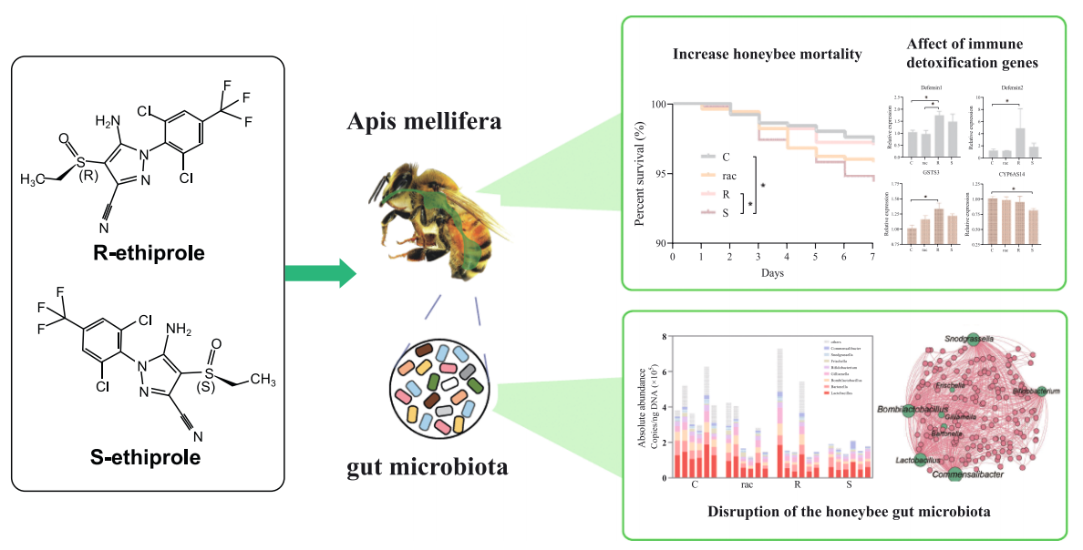 廣泛使用的農藥被認為是導致蜜蜂種群下降的主要因素之一。先前的研究表明,手性農藥的對映體可能對蜜蜂具有不同的毒性,但農藥對映體對蜜蜂及其腸道微生物的影響仍不清楚。該研究評估了蜜蜂在15 μg/L濃度下暴露于乙蟲(chóng)腈對映體后的腸道微生物及其宿主毒性。與蔗糖對照組和R-乙蟲(chóng)腈相比,S-乙蟲(chóng)腈暴露顯著(zhù)降低了蜜蜂的存活率。值得注意的是,暴露于乙蟲(chóng)腈及其對映體的蜜蜂影響了蔗糖消耗和體重,并出現了腸道變薄和退化的情況。通過(guò)對蜜蜂腸道的16S rRNA基因擴增子測序發(fā)現,乙蟲(chóng)腈及其對映體顯著(zhù)破壞了微生物群落。相比之下,S-乙蟲(chóng)腈暴露顯著(zhù)減少了群落規模和多樣性,并表現出較低的生態(tài)位寬度。