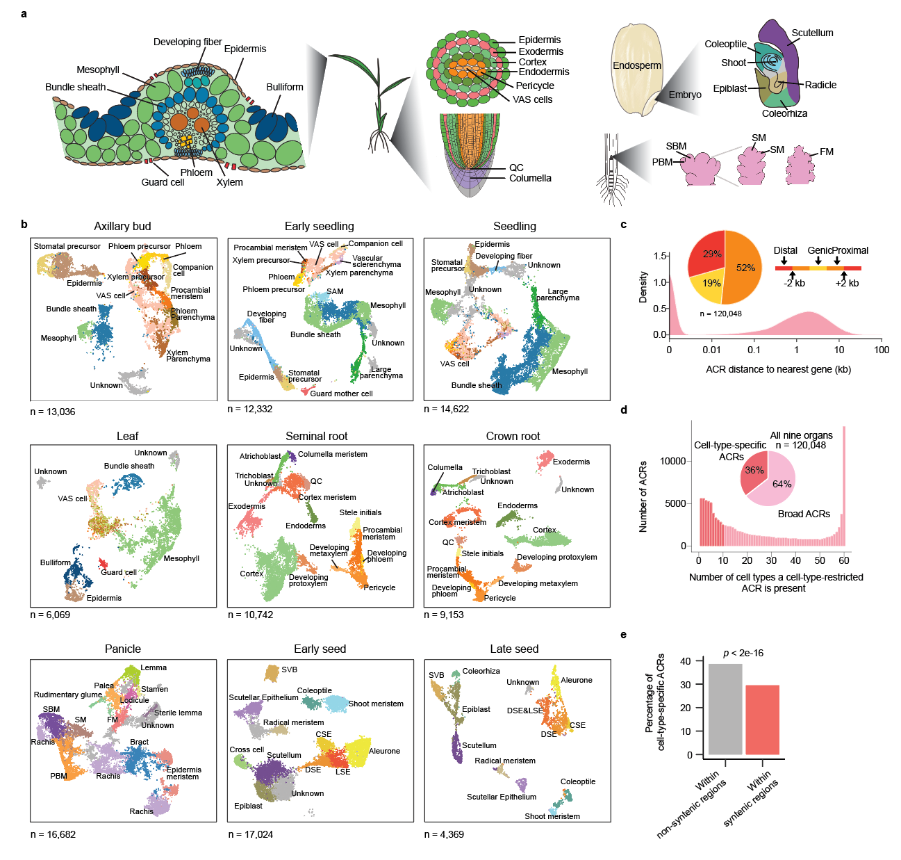 ② 該研究構建了一個(gè)全面的水稻(Oryza sativa)染色質(zhì)可及性單細胞圖譜,整合了來(lái)自103,911個(gè)細胞核、代表126種離散細胞狀態(tài)的九個(gè)不同器官的數據。通過(guò)比較基因組學(xué),分析了水稻與另外四種禾本科植物(玉米?Zea mays、高粱?Sorghum bicolor、黍?Panicum miliaceum?和?Urochloa fusca)中57,552個(gè)細胞核的細胞類(lèi)型分辨染色質(zhì)可及性之間的差異。