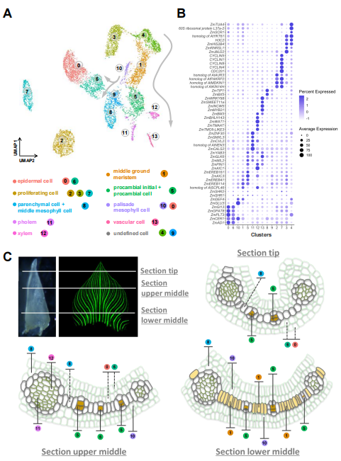 ③ 該研究描繪了從發(fā)展中的玉米原基尖端向下的潛在維管束鞘細胞亞群和不同層次的葉肉細胞。