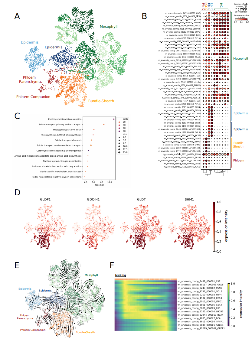 ② 該研究利用最近在單細胞轉錄組測序方面的進(jìn)展,更好地理解新的細胞特化如何影響相互關(guān)聯(lián)的途徑。研究人員為具有C3-C4中間特征的堇娘芥(Moricandia arvensis)生成了單細胞核RNA測序數據集,并將其與公開(kāi)可用的C3擬南芥(Arabidopsis thaliana)葉組織的單細胞轉錄組進(jìn)行了比較,還通過(guò)免疫金標記技術(shù)結合電子顯微鏡獨立驗證了選定光呼吸蛋白的定位。