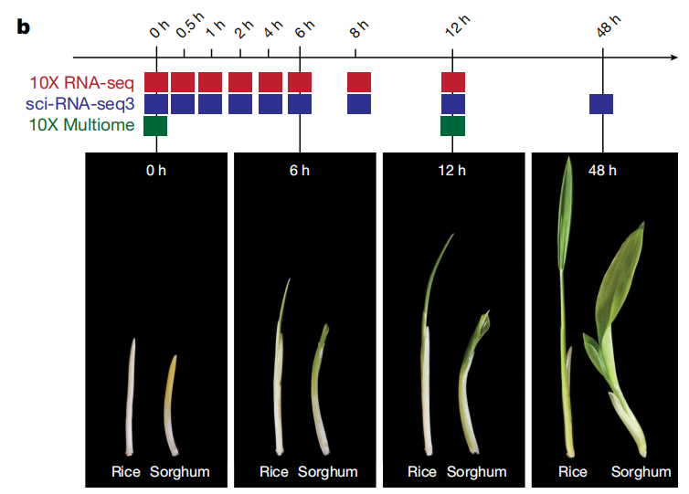 單細胞核轉錄組:水稻和高粱幼苗暗生長(cháng)5天后,在光周期(12h光/12h暗)中采集0h(暗)、0.5h、1h、2h、4h、6h、8h、12h、48h共9個(gè)時(shí)間點(diǎn)的地上組織??傆嬎?90,569個(gè)核、高粱265,701個(gè)核。