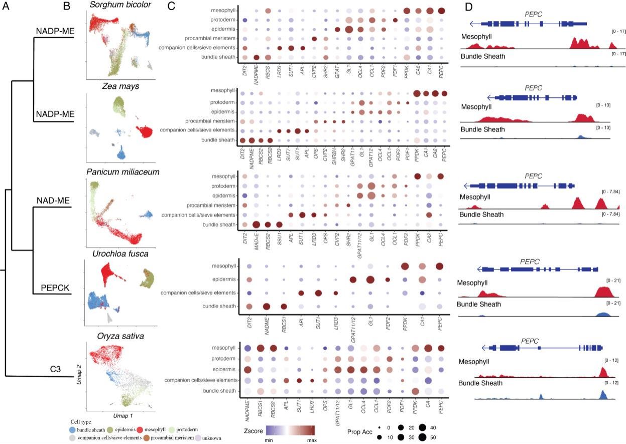 ② 該研究使用單細胞sci-ATAC-seq來(lái)鑒定與C4酶相關(guān)的特異細胞類(lèi)型的可及染色質(zhì)區域(ACRs),研究涵蓋了五種不同的禾本科植物,包括四種C4植物和一種C3植物。其中,C4植物分屬三種不同的光合亞型:玉米(Zea mays)和高粱(Sorghum bicolor)屬于NADP-ME亞型;黍(Panicum miliaceum)屬于NAD-ME亞型;Urochloa fusca屬于PEPCK亞型;C3植物水稻(Oryza sativa)