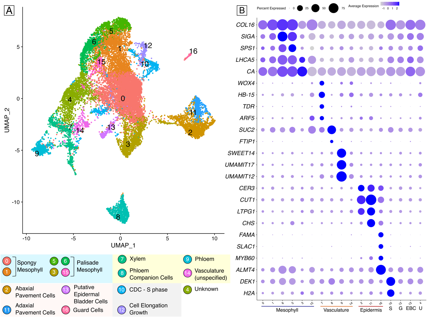 單細胞核測序:共獲取17,994個(gè)高質(zhì)量核,注釋17個(gè)細胞簇,覆蓋葉肉(海綿/柵欄)、表皮、保衛細胞、木質(zhì)部、韌皮部等