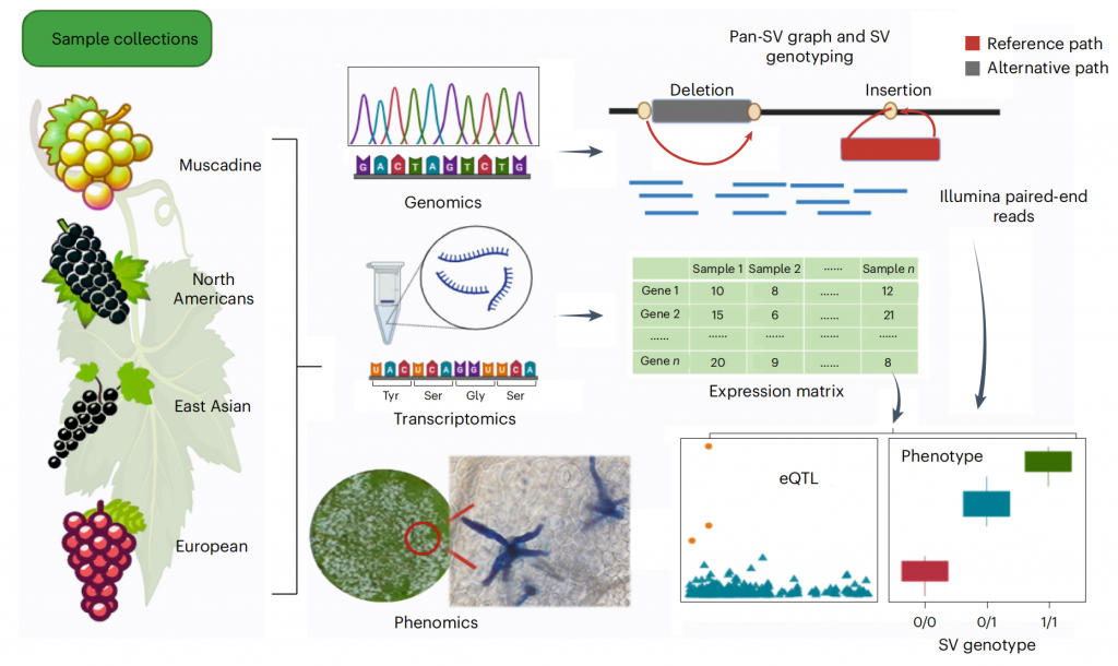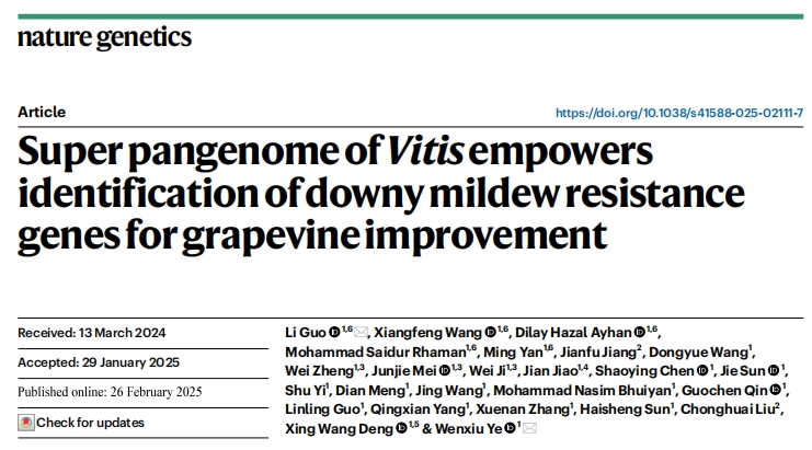 2025年02月26日,濰坊現代農業(yè)山東省實(shí)驗室、北京大學(xué)現代農業(yè)研究院葉文秀研究員和郭立研究員團隊在國際期刊《自然-遺傳學(xué)(Nature Genetics)》上在線(xiàn)發(fā)表了題為Super pangenome of Vitis?empowers identification of downy mildew resistance genes for grapevine improvement的研究成果。作為葡萄科研領(lǐng)域里程碑式的重大突破,繪制了涵蓋葡萄屬的歐亞、北美和東亞世界三大種群的72個(gè)葡萄種質(zhì)材料的單倍型超級泛基因組圖譜,揭示葡萄屬豐富遺傳多樣性和雜交歷史,基于葡萄多組學(xué)數據,挖掘到葡萄霜霉病抗性相關(guān)遺傳變異和抗病基因,加速葡萄精準分子育種,開(kāi)啟葡萄種質(zhì)創(chuàng )新和利用新時(shí)代。百邁客生物為該研究提供了基因組、hic、轉錄組等測序服務(wù)。