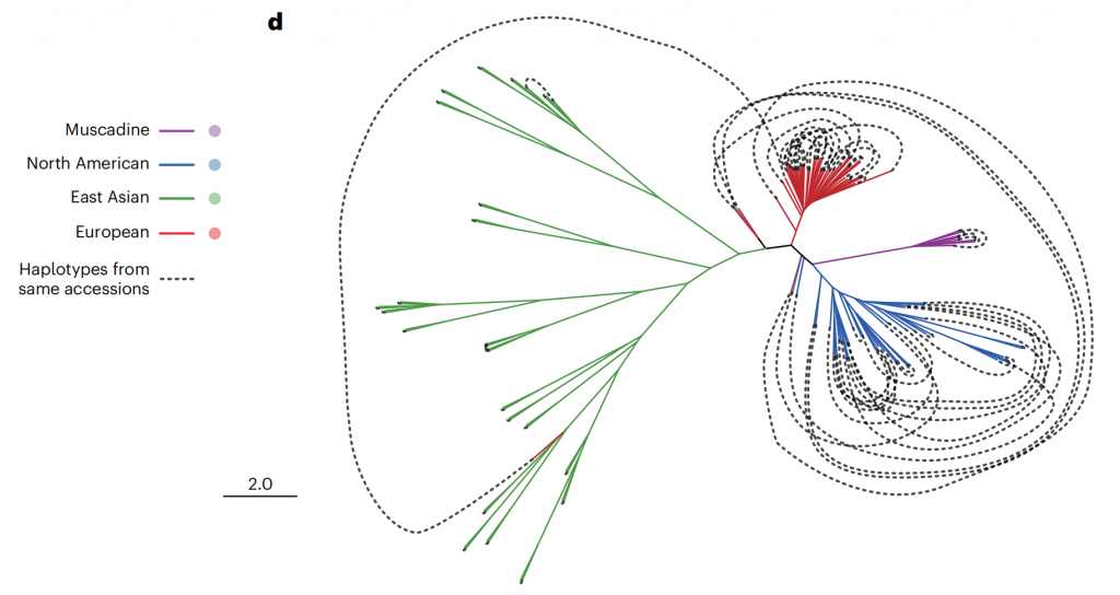 鑒于葡萄基因組因頻繁雜交而具有的高度雜合性,單倍型基因組不僅能精確解析雜合區域序列,而且對分析葡萄的育種歷史也至關(guān)重要。該研究構建了單倍型系統發(fā)育進(jìn)化樹(shù),揭示了葡萄屬植物復雜的育種歷史和豐富的遺傳多樣性。結果顯示,北美和歐洲品種存在較多內部雜交,而東亞品種的內部雜交較少,跨大洲雜交事件有限(圖2)。特別是東亞葡萄極少被開(kāi)發(fā)的遺傳多樣性,表明了其潛在的巨大育種價(jià)值。此次發(fā)布的東亞野生葡萄基因組為葡萄遺傳育種研究提供了強有力的資源支持。