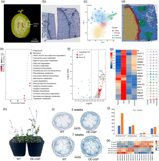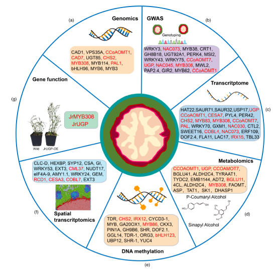 通過(guò)對十一個(gè)發(fā)育階段的轉錄組學(xué)、代謝組學(xué)、DNA甲基化和空間轉錄組學(xué)等多組學(xué)分析,揭示了多個(gè)與次生細胞生物合成和木質(zhì)素積累相關(guān)的候選基因,例如UGP、MYB308、MYB83、NAC043、NAC073、CCoAOMT1、CCoAOMT7、CHS2、CESA7、LAC7、COBL4和IRX12。在擬南芥(Arabidopsis thaliana)中過(guò)表達JrUGPJrMYB308驗證了它們在木質(zhì)素生物合成和細胞壁加厚中的作用。