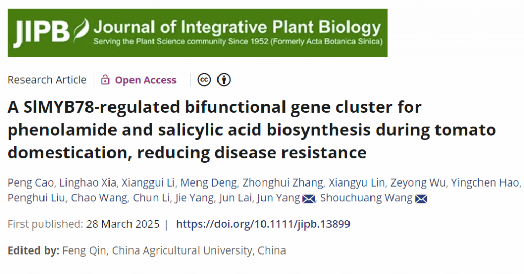 近日,《Journal of Integrative Plant Biology》在線(xiàn)發(fā)表了海南大學(xué)南繁學(xué)院王守創(chuàng )教授團隊題為“A SlMYB78-regulated bifunctional gene cluster for phenolamide and salicylic acid biosynthesis during tomato domestication, reducing disease resistance”的研究論文。首次揭示植物抗病代謝通路中存在雙功能基因簇(BGC2),其核心基因 SlEPS1在馴化中因負選擇導致功能衰退的分子機制:其編碼的雙功能酶兼具催化抗菌物質(zhì)酚胺與免疫激素水楊酸的雙重功能,為植物代謝與抗病研究提供新路徑。