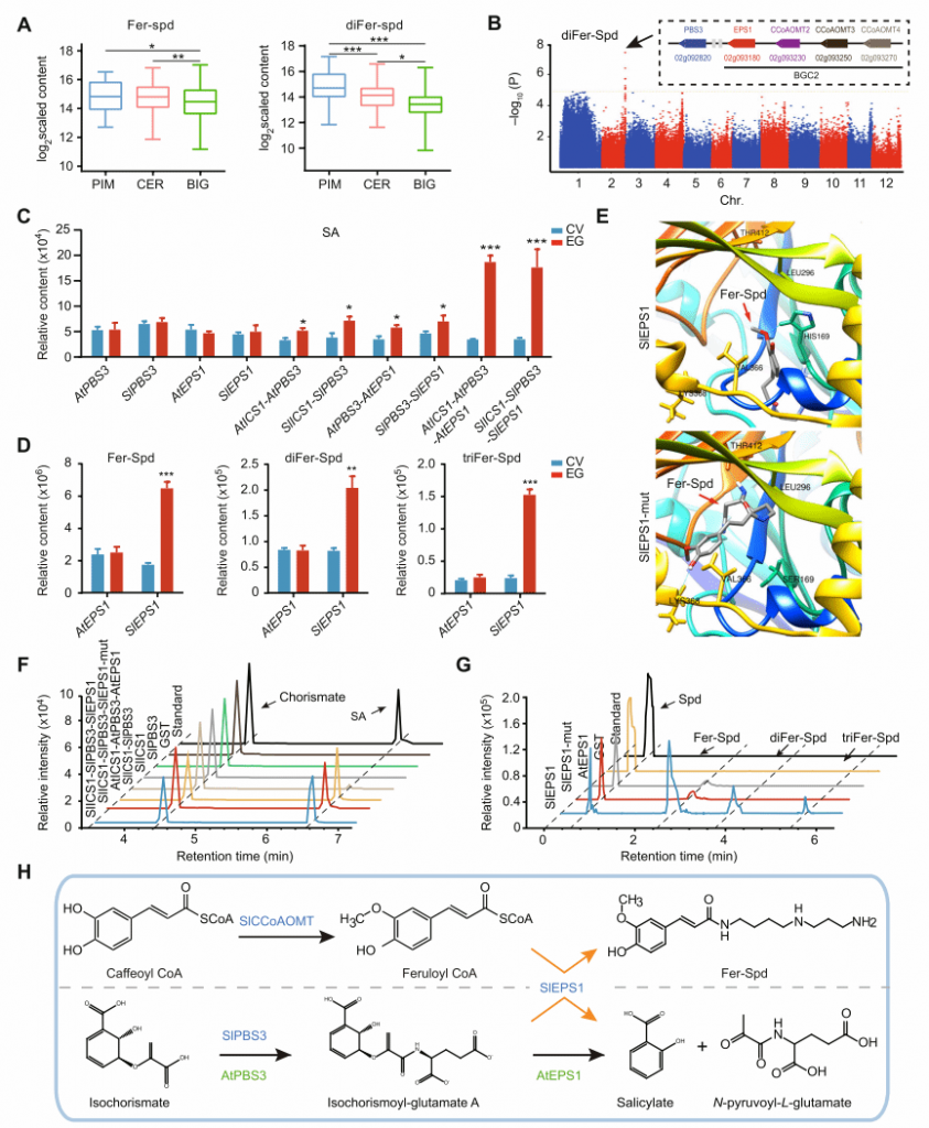 該研究對401份番茄群體材料的酚胺物質(zhì)進(jìn)行了檢測,通過(guò)基于代謝物全基因組關(guān)聯(lián)分析(GWAS)鑒定出2號染色體上與酚胺合成基因簇(BGC2)。實(shí)驗證明基因簇中核心組分SlEPS1參與水楊酸和酚胺的生物合成,其關(guān)鍵氨基酸殘基 His169對酚胺合成至關(guān)重要,且SlEPS1的雙酶活性與增強的抗病性相關(guān)(圖1)