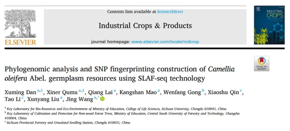 2025年4月2日,Industrial Crops & Products在線(xiàn)發(fā)表了由四川省林草局、四川大學(xué)生命科學(xué)學(xué)院王婧教授課題組聯(lián)合中南林業(yè)科技大學(xué)等多家單位合作完成的研究論文,題為” Phylogenomic analysis and SNP fingerprinting construction of Camellia oleifera Abel. germplasm resources using SLAF-seq technology”。該研究利用SLAF-seq技術(shù),對四川省主栽的來(lái)自我國南方25個(gè)主要油茶品種開(kāi)展了系統發(fā)育和群體基因組學(xué)研究,并篩選關(guān)鍵SNP標記構建了DNA指紋圖譜。該指紋圖譜的構建有望為我國南方尤其是四川地區油茶種質(zhì)資源保護、開(kāi)發(fā)利用及品種選育提供關(guān)鍵科學(xué)依據。