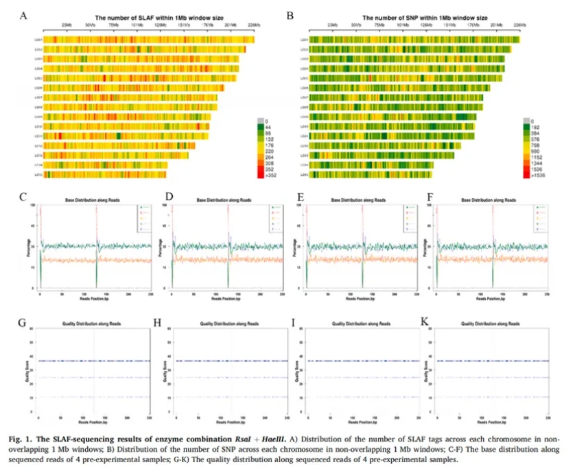 首先,研究共采集25個(gè)油茶栽培品種,共100個(gè)樣本,利用高通量SLAF-seq建庫策略進(jìn)行數據獲取。在建庫酶切方案篩選方面,團隊預先開(kāi)展酶切模擬試驗比較篩選最優(yōu)組合,Figure 1 顯示,RsaI + HaeIII組合在標簽分布均勻性、多態(tài)性與文庫復雜度上表現最佳。共獲得362,152個(gè)高質(zhì)量SLAF 標簽,其中254,357個(gè)為多態(tài)性標簽,平均GC含量41.30%,平均Q30高達93.44%,顯示測序數據具備極高的可靠性。RsaI + HaeIII雙酶切組合可實(shí)現高效的特異性位點(diǎn)擴增與標簽標準化,為后續大規模SNP檢測奠定了數據基礎。