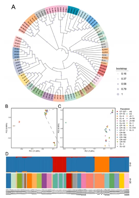 為了系統闡明25個(gè)油茶品種之間的親緣關(guān)系與遺傳結構,研究結合了鄰接法(NJ樹(shù))、主成分分析(PCA)與群體結構分析(ADMIXTURE)三種方法,進(jìn)行了系統發(fā)育與群體結構分析(Figure 3)。NJ樹(shù)的結果顯示,大多數樣本能夠根據其品種進(jìn)行合理聚類(lèi),呈現出明顯的系統發(fā)育規律。然而,部分品種則呈現出混合的聚類(lèi)模式,具體包括華碩HS與華鑫HX、湘林XL-3與湘林XL-210、以及湘林XL-1與長(cháng)林CL-4。而達林DL-22品種的個(gè)體聚類(lèi)較為分散且無(wú)序,表現出較為復雜的遺傳結構。在PCA分析中,前兩個(gè)主成分(PC1和PC2)解釋了大部分遺傳變異(PC1和PC2分別占11.20%和8.89%),并顯示出明顯的群體結構分布,這與NJ樹(shù)的聚類(lèi)結果高度一致。進(jìn)一步的群體結構分析表明,當K值為3時(shí),分析結果最佳,將品種劃分為三大類(lèi)群:第一類(lèi)群包括達林DL-1、長(cháng)林CL-4和湘林XL-1;第二類(lèi)群包括川榮CR-153、湘林XL-3和湘林XL-210;第三類(lèi)群則包括其余所有品種。需要注意的是,DL-22品種的個(gè)體表現出較高的遺傳混雜性,這可能與其基因漸滲、引種或雜交歷史相關(guān)。這些分析結果為進(jìn)一步理解油茶品種的遺傳多樣性、進(jìn)化關(guān)系以及品種改良提供了重要的遺傳信息。