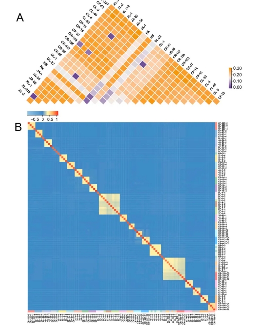 通過(guò)計算品種兩兩之間的Fst值與構建遺傳距離矩陣,研究進(jìn)一步明確了油茶品種間的遺傳分化程度和親緣關(guān)系(Figure 5)。Fst值的分析結果顯示,長(cháng)林CL-4、達林DL-1與湘林XL-1三者之間的Fst值極低(0.0106–0.0110),這表明這些品種可能源自相同或相似的遺傳背景。類(lèi)似地,川榮CR-153與湘林XL-3、湘林XL-210之間的Fst值也表現出較高的遺傳相似性(0.0036–0.0442),提示這些品種可能具有共同的祖源關(guān)系。相比之下,達林DL-22與川榮CR-50(0.0816)、川榮CR-55(0.0870)和達林DL-1(0.0759)之間的Fst值較高,顯示出較為顯著(zhù)的遺傳分化,反映其與這些品種的親緣關(guān)系較為緊密,但仍保持一定的遺傳獨特性。其它品種的Fst值范圍從0.1013到0.2908,表明這些品種的遺傳起源更加多樣,可能涉及不同的地理區域或品種間的較大差異(Figure 5A)。研究人員進(jìn)一步使用GCTA軟件計算的G矩陣分析,結果顯示大多數油茶品種之間的親緣關(guān)系較為明顯,遺傳分化較大(Figure 5B)。然而,一些品種群體的親緣關(guān)系值相似,例如XL-1、CL-4與DL-1;CR-153、XL-3與XL-210;華碩HS與華鑫HX,表明這些品種可能源自相同或相近的祖先背景。與此不同,達林DL-22品種在其群體內部未顯示出顯著(zhù)的親緣關(guān)系,反映出其群體內存在較高的遺傳分化??傮w而言,這些分析為理解油茶品種的遺傳背景和親緣結構提供了重要依據,揭示了不同品種之間的親緣關(guān)系及其遺傳多樣性。