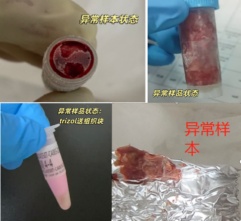 7)凍融組織: 組織凍存后,一旦凍融,核酸降解概率大于 80%,幾乎不可能提取成功,此類(lèi)組織不建議送樣。請各位老師送樣前注意組織保存狀態(tài), 確保組織未發(fā)生過(guò)凍融情況