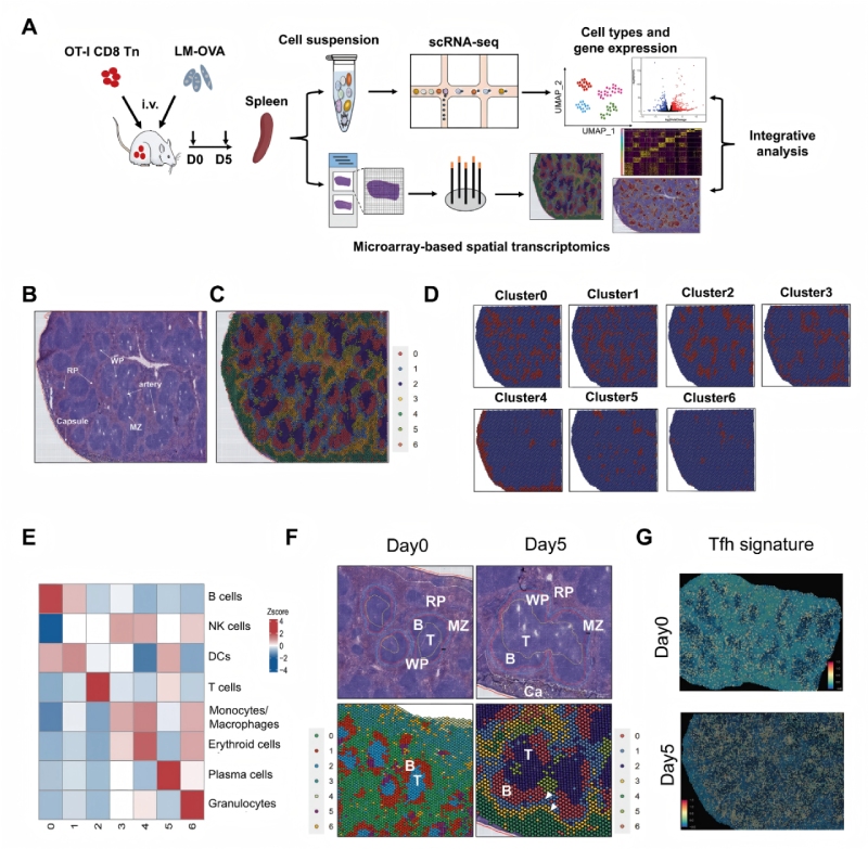 為了研究免疫反應過(guò)程中不同免疫細胞的空間分布和CD8+?T細胞分化的調節機制,研究人員通過(guò)整合單細胞RNA測序(scRNA-seq)和BMKMANU?S1000空間轉錄組(ST)技術(shù),分析了急性感染模型中脾臟免疫細胞的空間分布與CD8??T細胞分化機制。實(shí)驗采用OT-I轉基因小鼠模型,通過(guò)李斯特菌(LM-OVA)感染誘導免疫反應,關(guān)鍵發(fā)現包括:1)脾臟形成7個(gè)功能集群(B細胞、T細胞、單核/巨噬細胞等);2)感染后T/B細胞區擴大,APCs(B細胞、DC、巨噬細胞)在T細胞區外圍聚集;3)空間重組與T細胞分化(MP/TE亞群)顯著(zhù)相關(guān)。多組學(xué)整合揭示了免疫微環(huán)境的動(dòng)態(tài)調控機制,為理解感染中細胞互作提供了多組學(xué)視角。