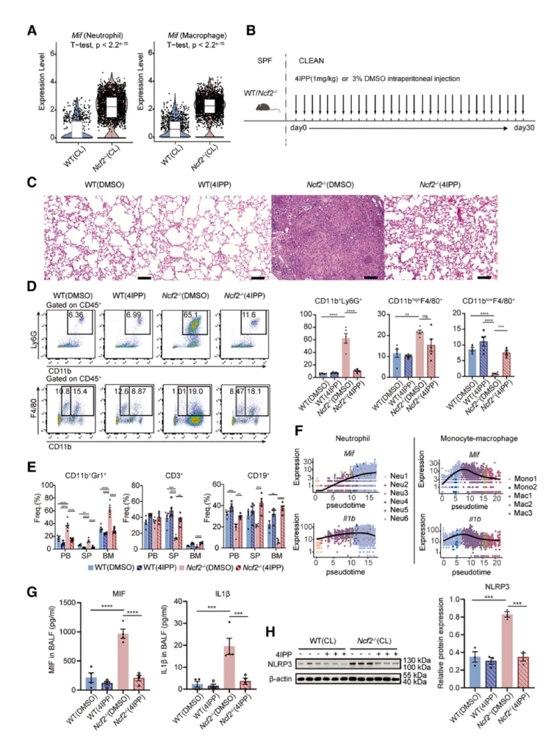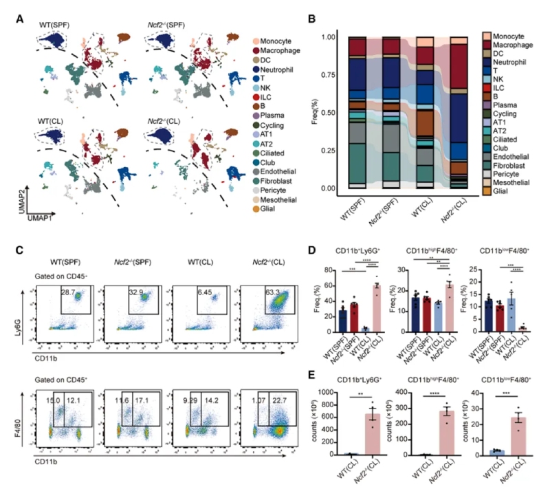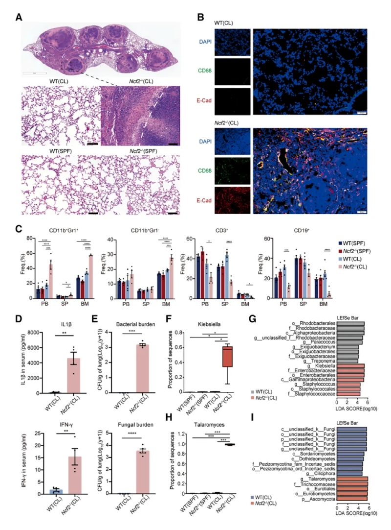 通過(guò)不同環(huán)境暴露(SPF或CL)實(shí)驗,系統研究了環(huán)境病原體對CGD遺傳背景小鼠表型的影響。表現為HE染色全肺葉顯微圖像可見(jiàn)CL環(huán)境下的Ncf2?/?小鼠肺部出現明顯的肉芽腫結構,伴隨炎癥細胞浸潤和組織壞死,其他組小鼠肺部正常。免疫熒光顯示肉芽腫中的巨噬細胞(CD68+)表達上皮標志物E-cadherin,提示巨噬細胞發(fā)生上皮樣轉化。通過(guò)ELISA法檢測CL?Ncf2?/?小鼠血清中的IL-1β和IFN-γ炎癥相關(guān)蛋白水平較CL?WT組增加。16S?rRNA/ITS?測序顯示CL?Ncf2?/?小鼠肺部細菌(如克雷伯菌和葡萄球菌)和真菌(如Talaromyces)負荷顯著(zhù)增加。