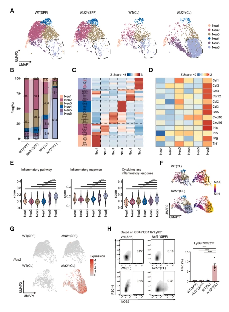研究顯示,中性粒細胞分為6個(gè)亞群,其中Neu6亞群在CL?Ncf2?/?小鼠中顯著(zhù)擴增且Neu6高表達促炎基因(如Nos2、Mif、Tnf、Il1b)。NO是一種在病原體清除過(guò)程中起關(guān)鍵作用由NOS2合成的可擴散小分子,CL?Ncf2?/?小鼠肺部的總NO生成量顯著(zhù)升高。流式驗證顯示CL?Ncf2?/?小鼠肺中NOS2high中性粒細胞比例顯著(zhù)增加。這些結果均提示NOS2high中性粒細胞通過(guò)產(chǎn)生一氧化氮(NO)和促炎因子,驅動(dòng)肉芽腫核心區的炎癥反應。