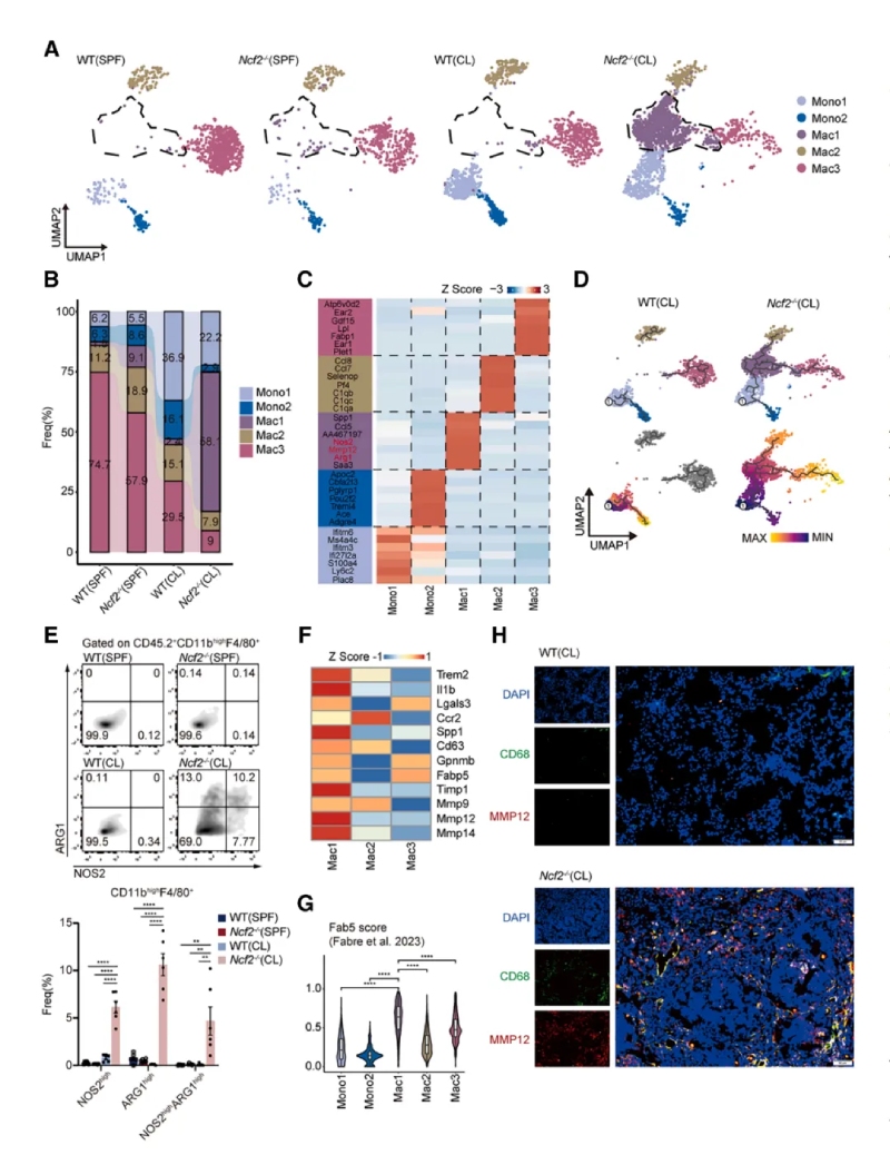 通過(guò)對巨噬細胞亞群進(jìn)行聚類(lèi)分析和功能富集,發(fā)現巨噬細胞分為5個(gè)亞群,Mac1亞群在CL?Ncf2?/?小鼠中顯著(zhù)增加。Mac1同時(shí)表達M1(Nos2)和M2(Arg1)標志物,以及促纖維化基因(如Mmp12、Spp1)。免疫熒光顯示MMP12+巨噬細胞特異性分布于肉芽腫外圍。以上結果提示MMP12+巨噬細胞具有混合表型,可能通過(guò)細胞外基質(zhì)重塑促進(jìn)肉芽腫的纖維化包裹。