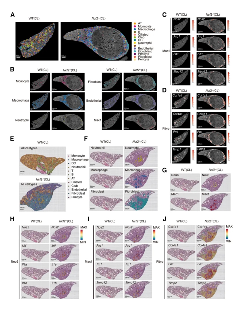 慢性肉芽腫病(Chronic?Granulomatous?Disease,?CGD)是一種由NADPH氧化酶2(NOX2)復合體功能缺失突變引起的原發(fā)性免疫缺陷病。這種缺陷會(huì )導致產(chǎn)生ROS的多種先天免疫細胞受到損害,機體抵御微生物的能力下降,導致CGD患者易發(fā)生反復感染和過(guò)度炎癥反應。本研究通過(guò)構建自然CGD小鼠模型,結合單細胞轉錄組(scRNA-seq)和空間轉錄組技術(shù)(包括BMKMANU?S1000平臺),深入解析了CGD肺部肉芽腫形成的細胞與分子機制,從CGD肺肉芽腫組織中鑒定出具有NOS2高表達特征的中性粒細胞和MMP12+巨噬細胞,并提出MIF和Morbidity為CGD治療的潛在靶點(diǎn)。
