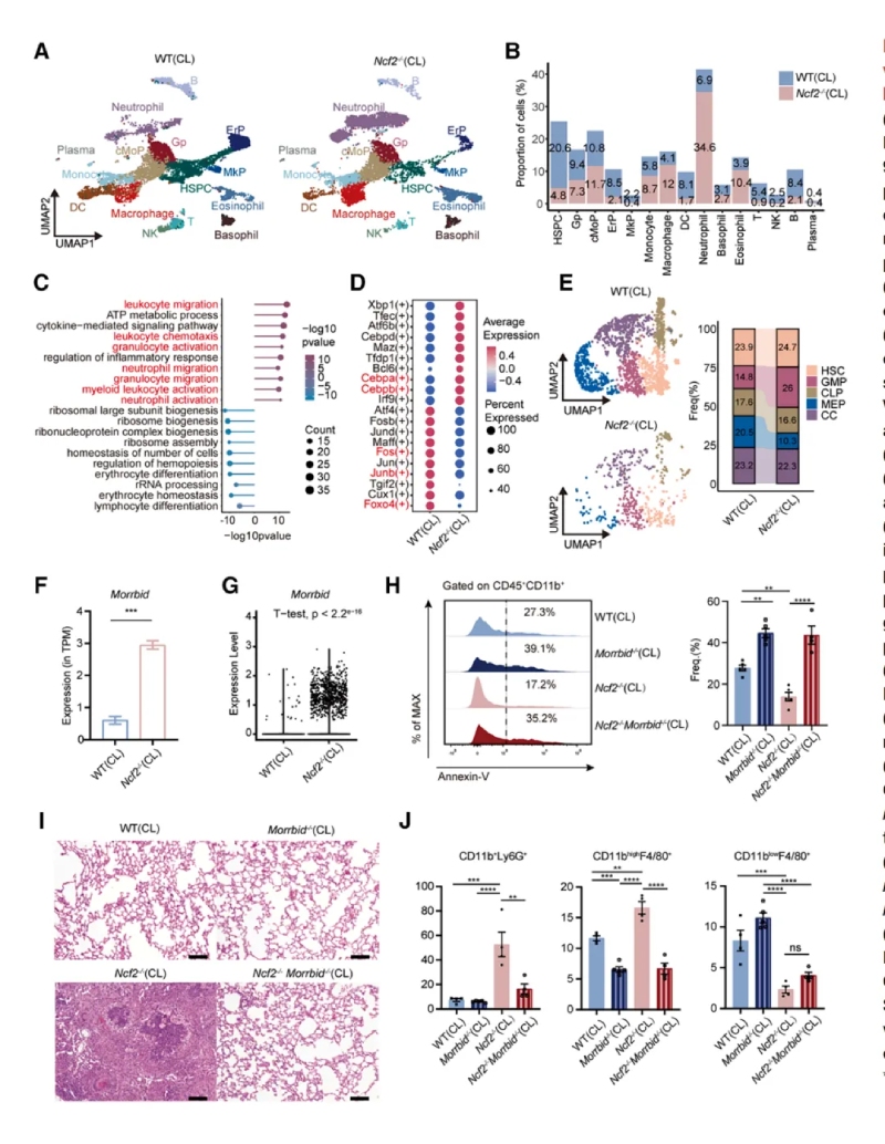 通過(guò)單細胞RNA測序和流式細胞術(shù)分析發(fā)現CGD小鼠肺部炎癥微環(huán)境以髓系細胞浸潤為主,提示其參與肉芽腫形成。其中單細胞測序,最終保留了25296個(gè)高質(zhì)量細胞樣本,每個(gè)細胞平均包含6466條比對讀數和1972個(gè)基因,并識別出9種免疫細胞類(lèi)型及九種基質(zhì)細胞類(lèi)型。還發(fā)現一個(gè)以細胞周期相關(guān)基因(Mki67和Top2a)高表達為特征的細胞簇。通過(guò)流式細胞術(shù)分析發(fā)現,CL?Ncf2?/?小鼠中CD11b高表達的F4/80+MDMs在比例和絕對數量上均顯著(zhù)增加,這些結果揭示了慢性肉芽腫性葡萄膜炎(CGD)小鼠在肺部感染過(guò)程中免疫細胞組成的顯著(zhù)變化,尤其是中性粒細胞和MDMs的明顯聚集現象。