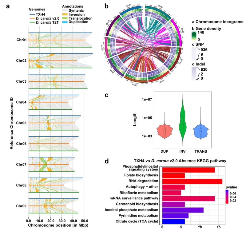 該研究成功組裝了TXH4的T2T無(wú)間隙基因組。與兩個(gè)橙色胡蘿卜參考基因組(黑田型、南特型)比較,分別鑒定出2,466,422和2,037,986個(gè)SNP,以及500,579和474,704個(gè)InDel。更重要的是,KEGG通路分析發(fā)現,類(lèi)胡蘿卜素生物合成通路中的基因富集了大量TXH4的特異性變異,初步揭示了紅色類(lèi)胡蘿卜素的積累模式與南特、黑田五寸等橙色胡蘿卜存在顯著(zhù)差異。