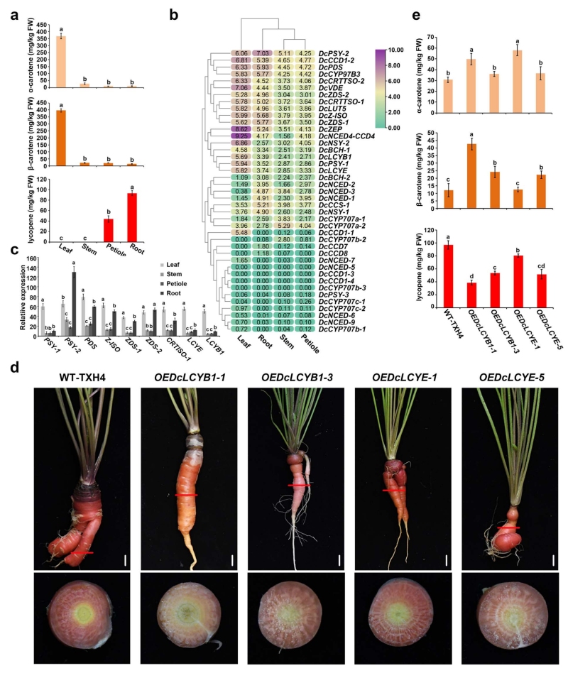 代謝組分析證實(shí),TXH4肉質(zhì)根中番茄紅素的含量極高,是葉片含量的1965倍,而下游產(chǎn)物α-胡蘿卜素和β-胡蘿卜素的含量極低(僅為葉片的2.7%和3.5%)。這一“上游淤積、下游匱乏”的代謝模式,在轉錄組層面找到了直接原因:催化番茄紅素向下游轉化的兩個(gè)關(guān)鍵酶基因——DcLCYB1(番茄紅素β-環(huán)化酶基因)與DcLCYE(番茄紅素ε-環(huán)化酶基因),在TXH4肉質(zhì)根中的表達量較葉片顯著(zhù)下調,其表達抑制與番茄紅素的高積累形成直接關(guān)聯(lián)。