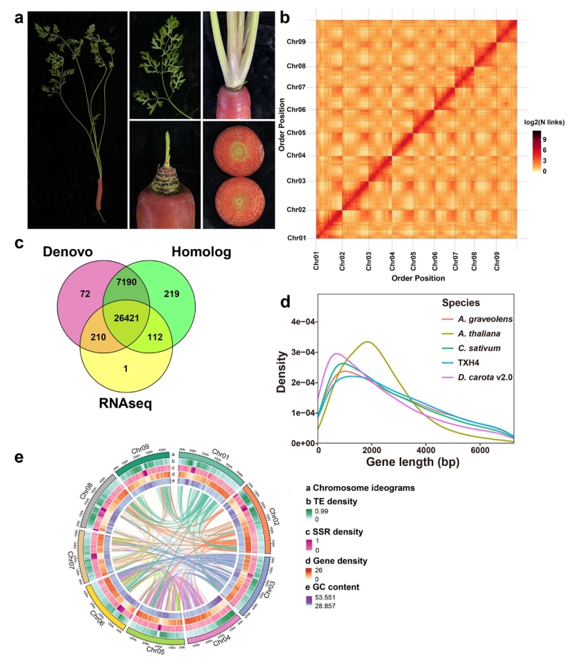 為解析上述科學(xué)問(wèn)題,研究團隊選取紅色胡蘿卜高代自交系TXH4為材料,采用了前沿的多平臺測序技術(shù)進(jìn)行無(wú)間隙的端粒到端粒(T2T)基因組組裝。