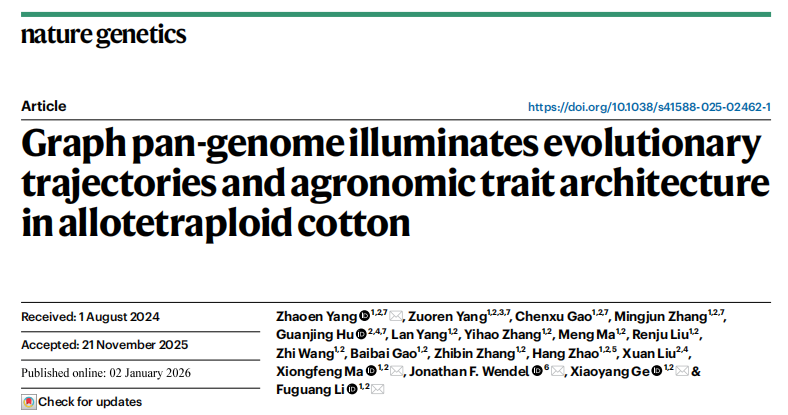 2026年1月2日,中國農業(yè)科學(xué)院棉花研究所李付廣/楊召恩研究員團隊在《Nature?Genetics》上發(fā)表了研究成果。題為“Graph?pan-genome?illuminates?evolutionary?trajectories?and?agronomic?trait?architecture?in?allotetraploid?cotton”。
