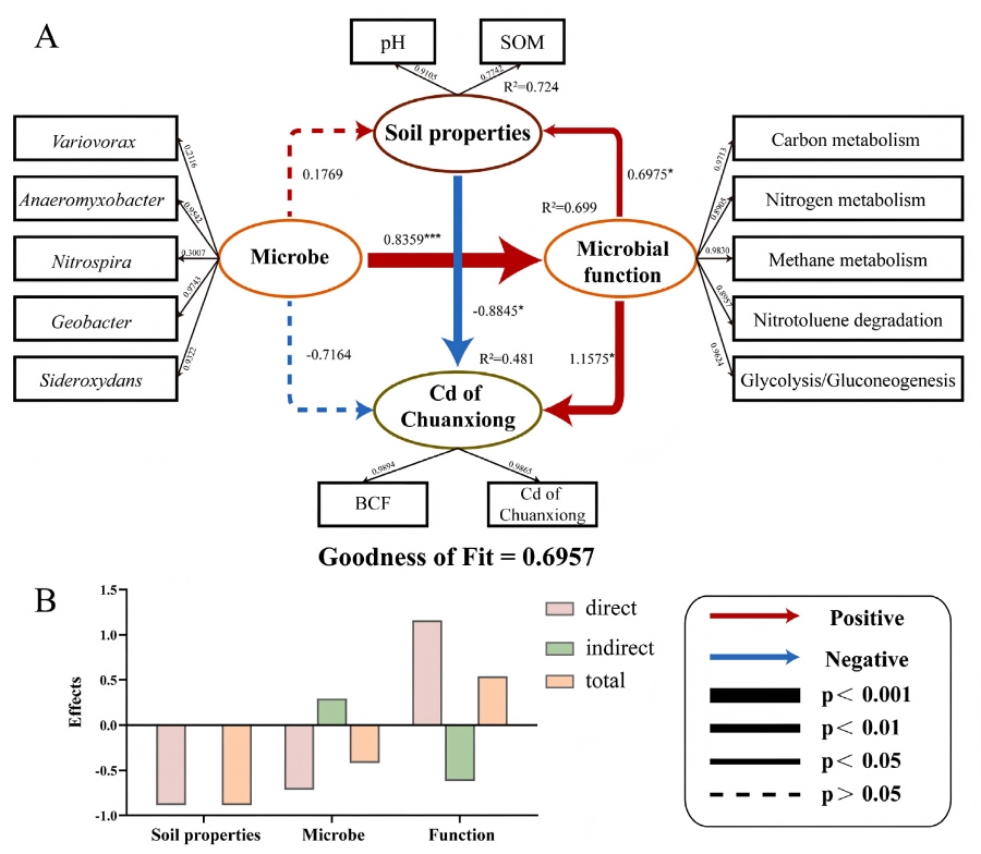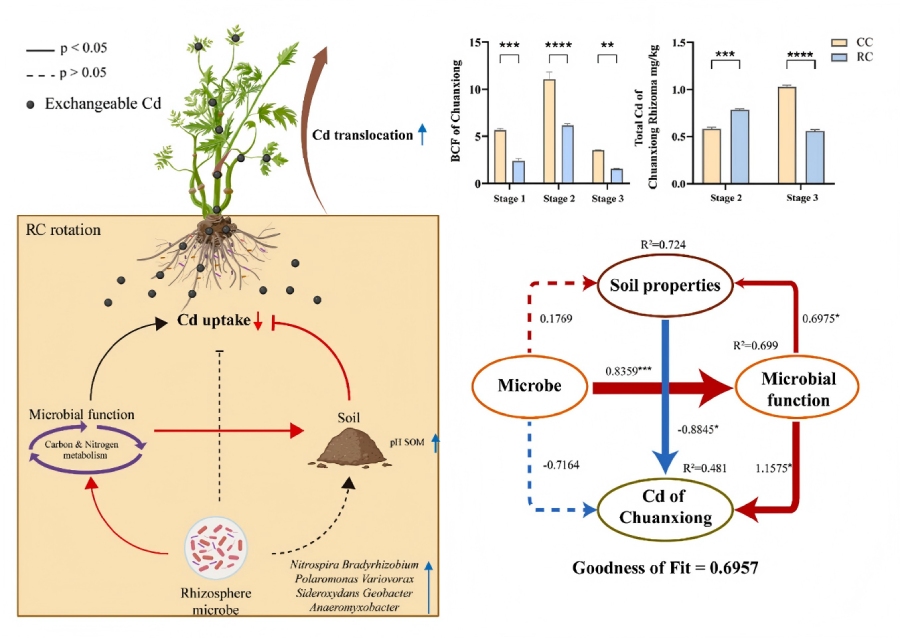 該研究采用多學(xué)科整合方法開(kāi)展系統性探究:首先在四川鎘污染農田設置?“稻?–?川芎輪作(RC)”?與?“川芎連作(CC)”?對照試驗,追蹤川芎全生育期生長(cháng)指標;隨后通過(guò)HPLC測定活性成分、ICP-MS分析鎘含量、宏基因組解析根際微生物群落;結合土壤理化性質(zhì)檢測、酶活性分析,最終利用PLS-SEM模型構建?“微生物?–?功能?–?土壤性質(zhì)?–?鎘積累”?調控網(wǎng)絡(luò )。研究發(fā)現: